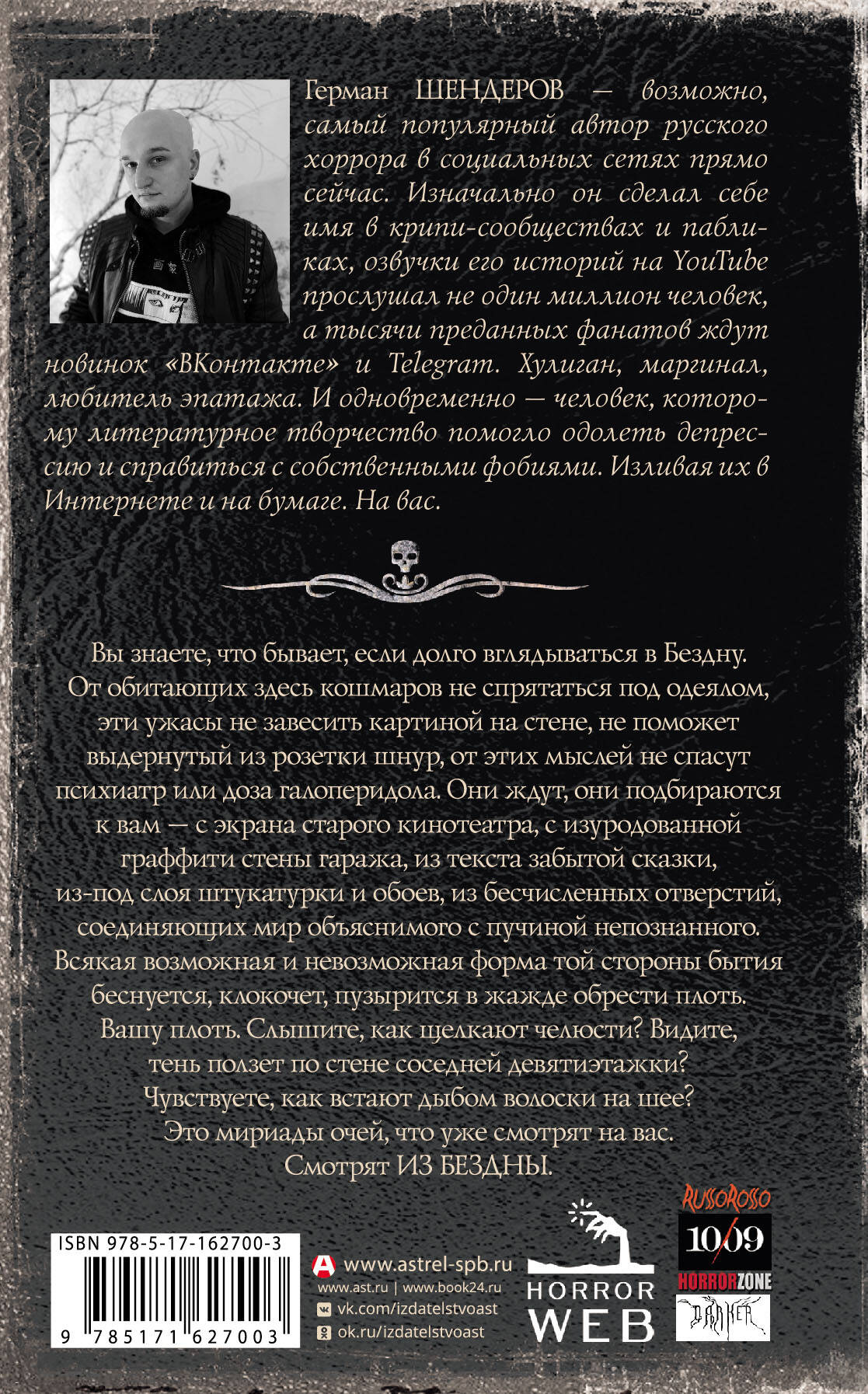 Вы знаете, что бывает, если долго вглядываться в Бездну. От обитающих здесь кошмаров не спрятаться под одеялом, эти ужасы не завесить картиной на стене, не поможет выдернутый из розетки шнур, от этих мыслей не спасут психиатр или доза галоперидола. Они ждут, они подбираются к вам - с экрана старого кинотеатра, с изуродованной граффити стены гаража, из текста забытой сказки, из-под слоя штукатурки и обоев, из бесчисленных отверстий, соединяющих мир объяснимого с пучиной непознанного. Всякая возможная и невозможная форма той стороны бытия беснуется, клокочет, пузырится в жажде обрести плоть. Вашу плоть. Слышите, как щелкают челюсти? Видите, тень ползет по стене соседней девятиэтажки? Чувствуете, как встают дыбом волоски на шее? Это мириады очей, что уже смотрят на вас. Смотрят ИЗ БЕЗДНЫ.| Издательство | Издательство "АСТ" |