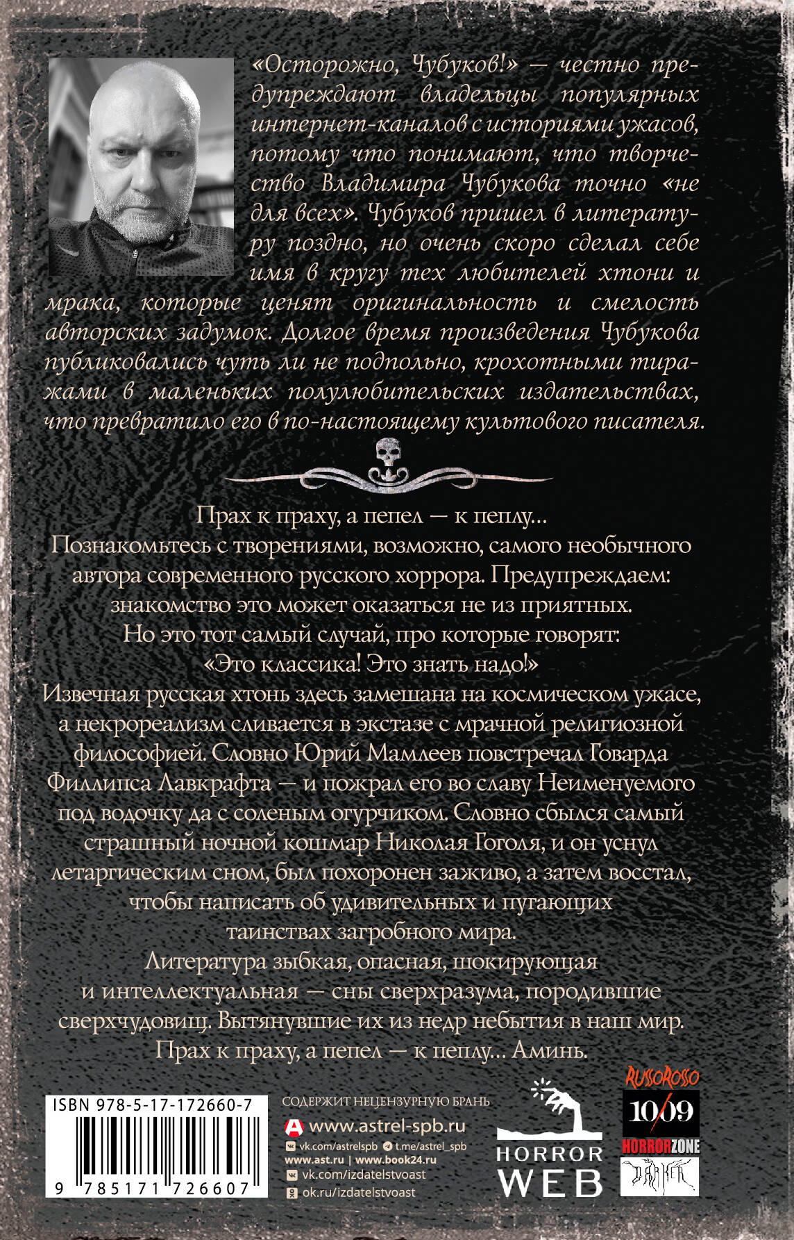- Новинка проекта «Самая страшная книга» - самой известной серии, посвященной русскому хоррору. - Авторский сборник рассказов Владимира Чубукова. В книгу вошли лучшие рассказы автора за последние шесть лет. - Владимир Чубуков - один из самых необычных авторов русского хоррора, его интересуют темы чудовищных метаморфоз человеческого существа и надвигающейся власти тьмы и ужаса. - «Прах и пепел» - не просто честная попытка напугать читателя, но увлеченное и увлекательное исследование самой природы темноты и того, что в ней скрывается.