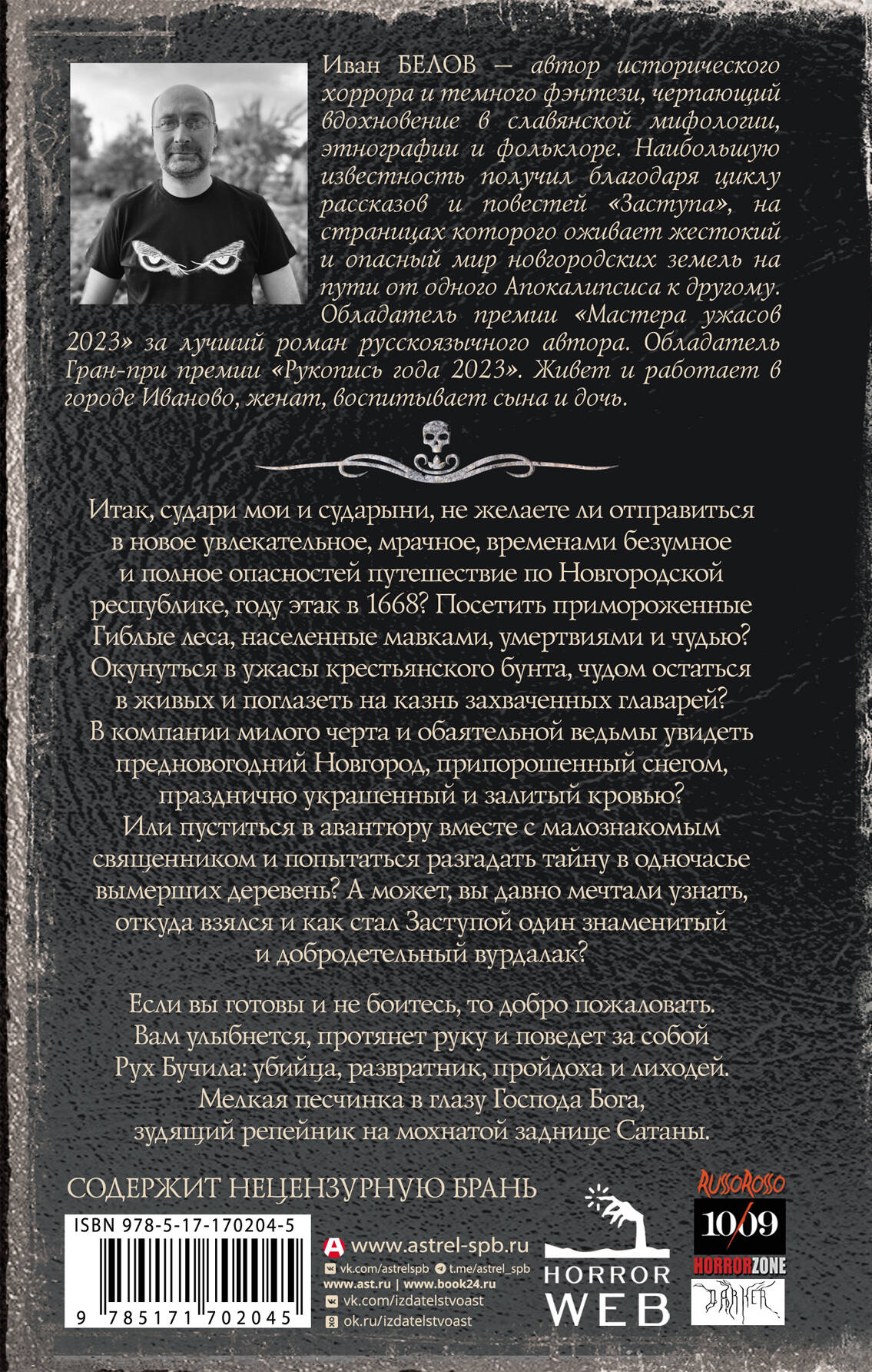 - «Чернее черного» - вторая книга цикла «Заступа». Читателей ждут пять новых историй о приключениях неподражаемого вурдалака Руха Бучилы. - «Заступа» - атмосферная смесь хоррора с темным фэнтези и славянским фольклором. Увлекательные сюжеты, обаятельный главный герой и первоклассный черный юмор прилагаются. - «Заступа» - это «Ведьмак» наоборот! Когда темнота окутывает мир, последней надеждой человечества становится проклятый Богом и людьми вурдалак! - «Все оттенки падали», первая книга цикла, завоевала Гран-при премии «Рукопись года», победила в номинации «Лучший роман русскоязычного автора» в премии «Мастера ужасов» и была признана Книгой года по версии портала «Лаборатория фантастики».| Издательство | Издательство "АСТ" |