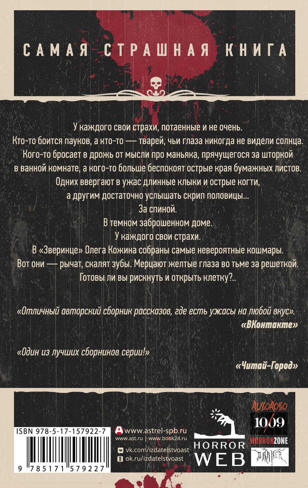 У каждого свои страхи, потаенные и не очень. Кто-то боится пауков, а кто-то - тварей, чьи глаза никогда не видели солнца. Кого-то бросает в дрожь от мысли про маньяка, прячущегося за шторкой в ванной комнате, а кого-то больше беспокоят острые края бумажных листов. Одних ввергают в ужас длинные клыки и острые когти, а другим достаточно услышать скрип половицы... За спиной. В темном заброшенном доме. У каждого свои страхи. В "Зверинце" Олега Кожина собраны самые невероятные кошмары. Вот они - рычат, скалят зубы. Мерцают желтые глаза во тьме за решеткой. Готовы ли вы рискнуть и открыть клетку?..| Издательство | ИЗДАТЕЛЬСТВО "АСТ" |
