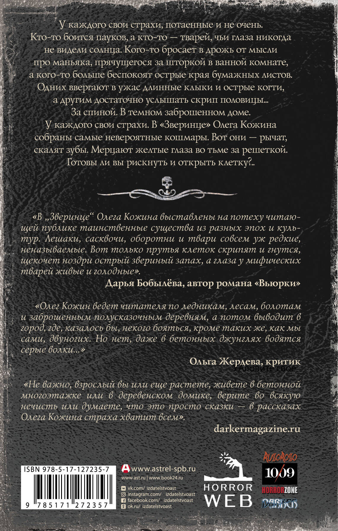 У каждого свои страхи, потаенные и не очень. Кто-то боится пауков, а кто-то - тварей, чьи глаза никогда не видели солнца. Кого-то бросает в дрожь от мысли про маньяка, прячущегося за шторкой в ванной комнате, а кого-то больше беспокоят острые края бумажных листов. Одних ввергают в ужас длинные клыки и острые когти, а другим достаточно услышать скрип половицы... За спиной. В темном заброшенном доме. У каждого свои страхи. В "Зверинце" Олега Кожина собраны самые невероятные кошмары. Вот они - рычат, скалят зубы. Мерцают желтые глаза во тьме за решеткой. Готовы ли вы рискнуть и открыть клетку?..| Издательство | Издательство "АСТ" |