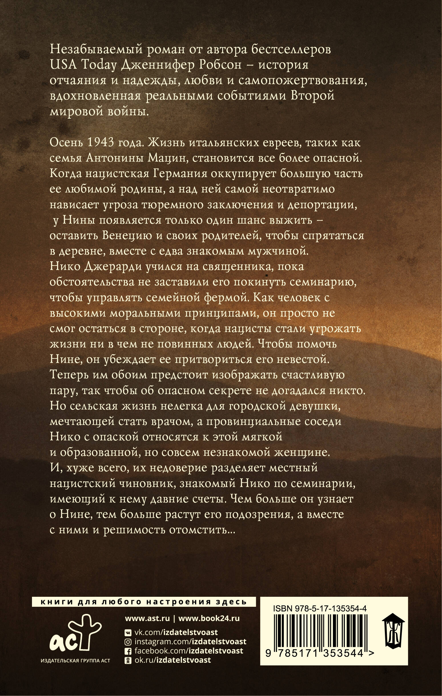 • Пронзительная история, вдохновленная реальными событиями Второй мировой войны. • Новая книга в полюбившейся серии «Звезды зарубежной прозы». • От автора бестселлера The USA Today «Платье королевы»! • «Аккуратное отношение к истории и идеальный темп повествования, все это в стилистике лирической прозы. Этот роман поразит читателей в самое сердце!» - Publisher's Weekly Италия, осень 1943 года. Жизнь еврейских семей становится все более тяжелой и опасной, угроза депортации и даже смерти - все более реальной. Для Антонины Мацин единственный шанс спастись - бежать. Нико Джерарди собирался стать священником, но вынужден был оставить учебу, чтобы вести хозяйство на ферме. Он соглашается выручить семью Мацин и увозит Антонину из Венеции в глухую деревню, выдавая ее за собственную жену. Теперь остается надеяться, что никто не усомнится в истории «молодоженов», ведь, если правда выйдет наружу, Нико окажется не в меньшей опасности, чем Антонина. Но местные жители не спешат принимать незнакомую городскую девушку, более того, на нее обратил пристальное внимание нацистский чиновник, знакомый Джерарди по семинарии. Он старается выведать о девушке как можно больше, чувствуя, что сможет наконец-то свести с Нико старые счеты. «Самая темная ночь» - шестой исторический роман Дженнифер Робсон. Интерес к истории, а также внимательное отношение к историческому материалу, она унаследовала от своего отца, профессора Стюарта Робсона, который посвятил свою академическую карьеру изучению обеих мировых войн.| Издательство | ИЗДАТЕЛЬСТВО "АСТ" |