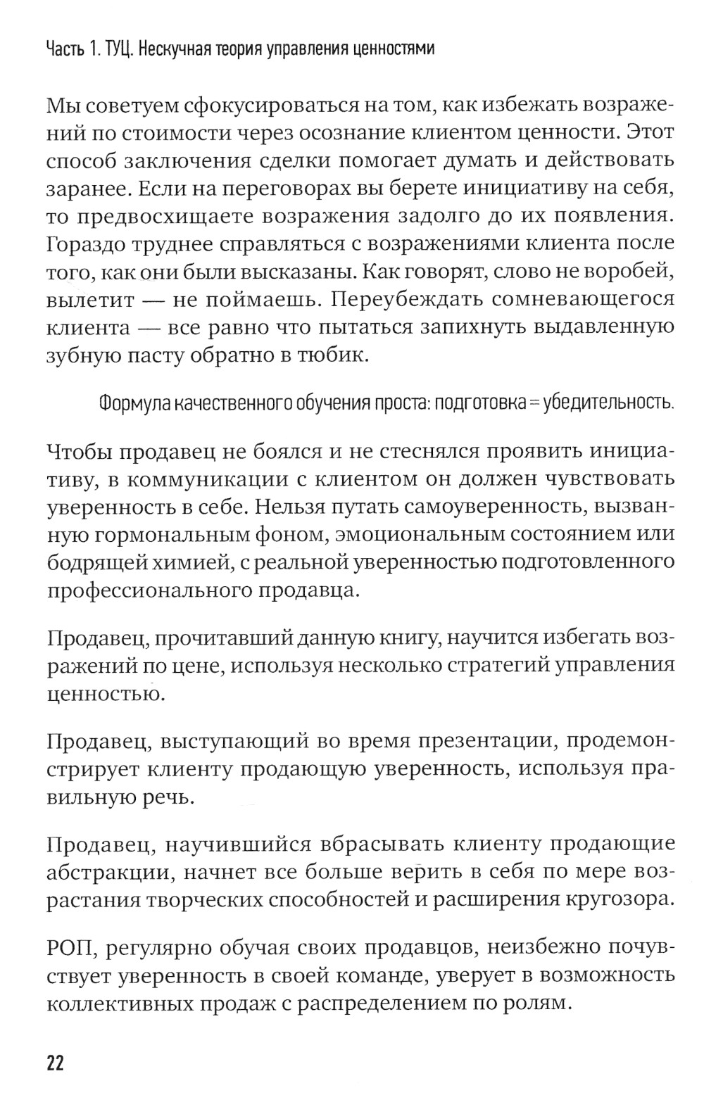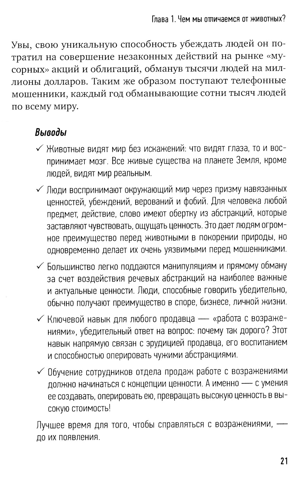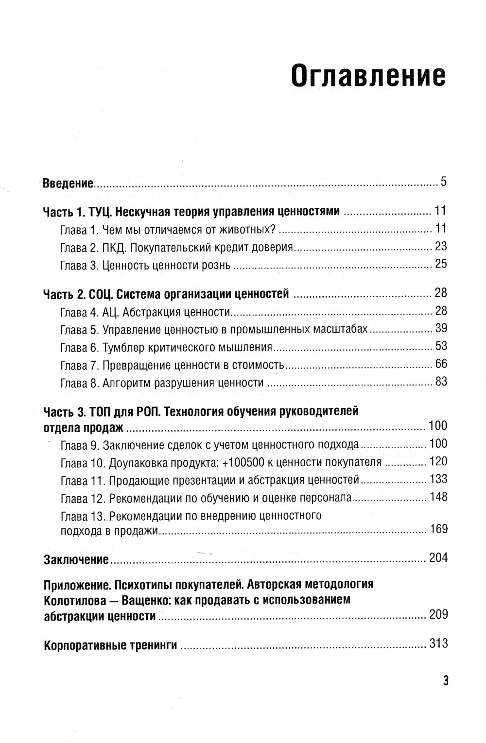 Эта книга о природе успешных коммерческих сделок через понимание психологического эффекта ценности в продажах. Благодаря авторской методике Колотилова - Ващенко, признанных бизнес-тренеров по продажам, вы овладеете искусством управления ценностью в глазах любого собеседника или делового партнера. Авторы детально разбирают концепцию абстракции ценности в контексте бизнеса, предлагают образцы конкретного ролевого поведения в различных деловых ситуациях и с разными психотипами людей, представляют практические рекомендации для получения среднесрочного и долгосрочного доверия корпоративных клиентов с использованием абстракции ценности. На конкретных примерах показано, как изменить процесс повышения квалификации сотрудников компании, чтобы увеличить продажи при одновременном снижении издержек на обучение продавцов. Издание адресовано руководителям отделов продаж, коммерческим директорам и будет полезно всем, кто хочет убедить людей в ценности своих идей или желает привлечь инвестиции в свой бизнес; кто обосновывает в корпорациях необходимость обновления производства или оборудования. Книга принесет практическую пользу всем, кто хочет изменить мотивацию людей, управляя их ценностями.| Издательство | Питер |