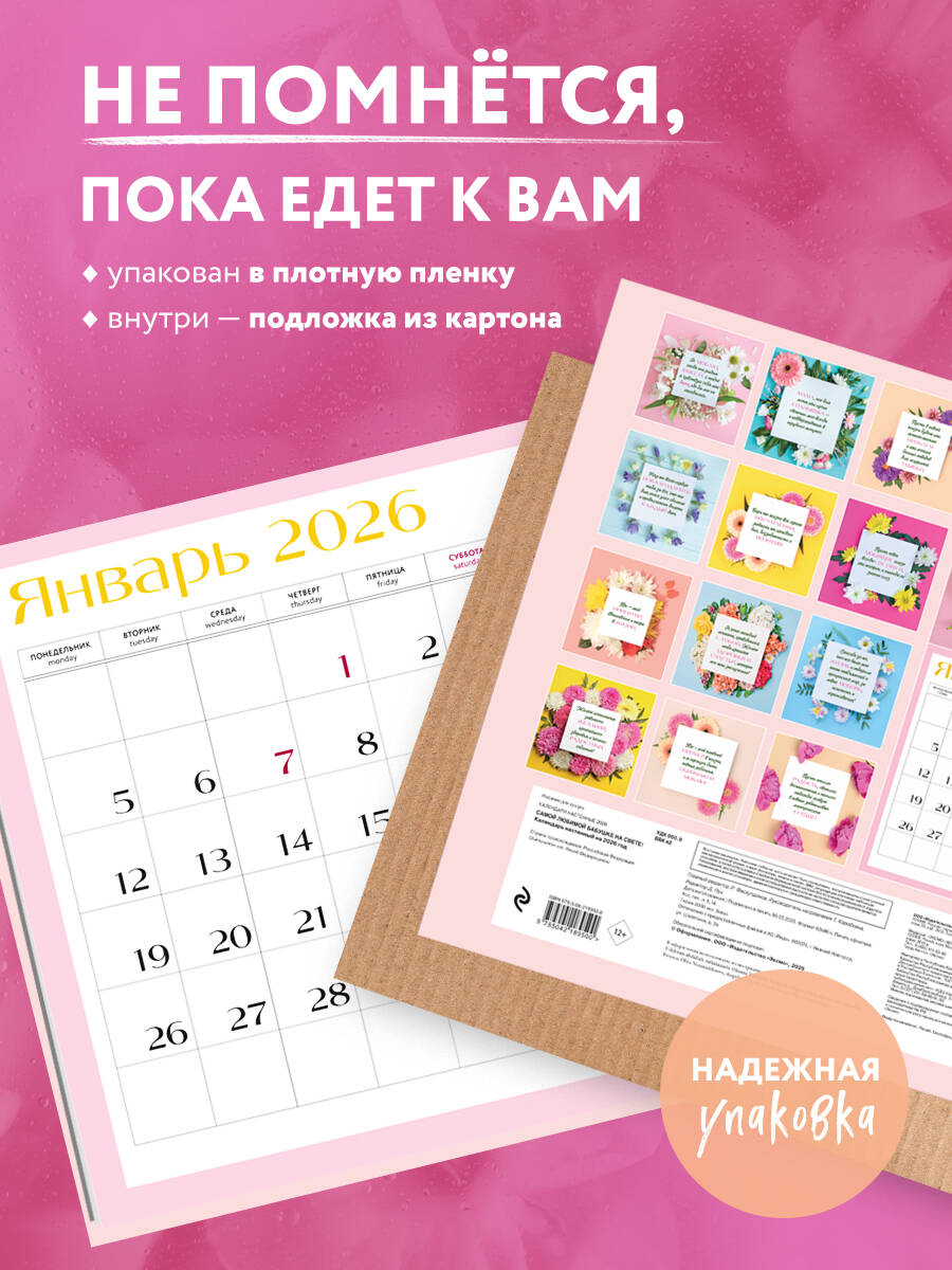 О календаре: Самая близкая и ценная, самая чудесная и милая, неповторимая и важнейшая - если в этих словах вы узнали свою маму, то порадуйте ее, подарив этот календарь, чтобы приятные комплименты от вас она слышала каждый день! Качественная бумага, большой формат (300х300мм) и удобная сетка! Отличный подарок для любимой мамы! О серии: Наши настенные календари отличаются высоким качеством исполнения! Тщательно подобранные иллюстрации, напечатанные на глянцевой бумаге высочайшего качества, станут настоящим украшением дома, а в календарной сетке найдется место для ваших планов: большие клетки позволят делать записи и организовать свой год! В календаре также отмечены все государственные праздники. В серии настенных календарей издательства «ЭКСМО» каждый найдет тему по вкусу: великие художники, великолепные подборки с самыми знаменитыми произведениями искусства, легендарные кинематографические саги и игры, главные книжные авторы и бестселлеры, фотографии и иллюстрации любимых животных и многое-многое другое! Технические параметры: • Тип календаря - настенный перекидной. • Год - 2026. • Календарная сетка - с разбивкой по месяцам. • Вид скрепления - скрепка. • Ширина - 30 см. • Высота - 30 см. • Внутренний блок - мелованная бумага 115 г/м2. • Подложка - плотный гофрокартон для поддержания формы. • Индивидуальная упаковка в плотный целлофановый пакет.| Издательство | ООО "Издательство "Эксмо" |