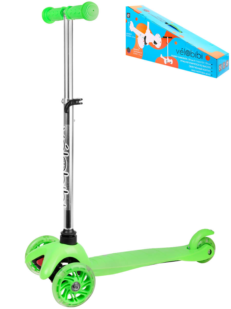 Аннотация: Самокат 3-х колесный зеленый (54*11*51-70) кол. 11/7,8см,PU,передн.свет,до 60кг)в кор. (Арт.И-3380)