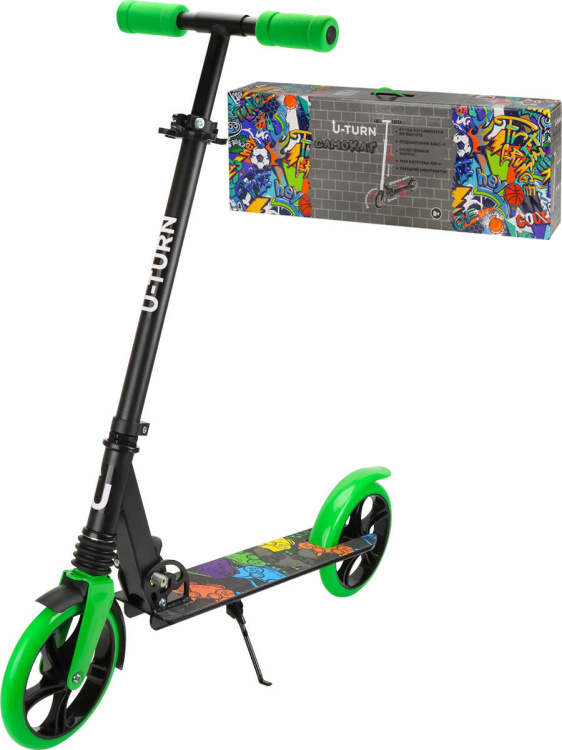 Аннотация: Самокат двухколес.(колеса PU 20см,85*11*79-103 см,макс.вес 100кг,черно-зелён.граффити)(Арт.СМК-9940)