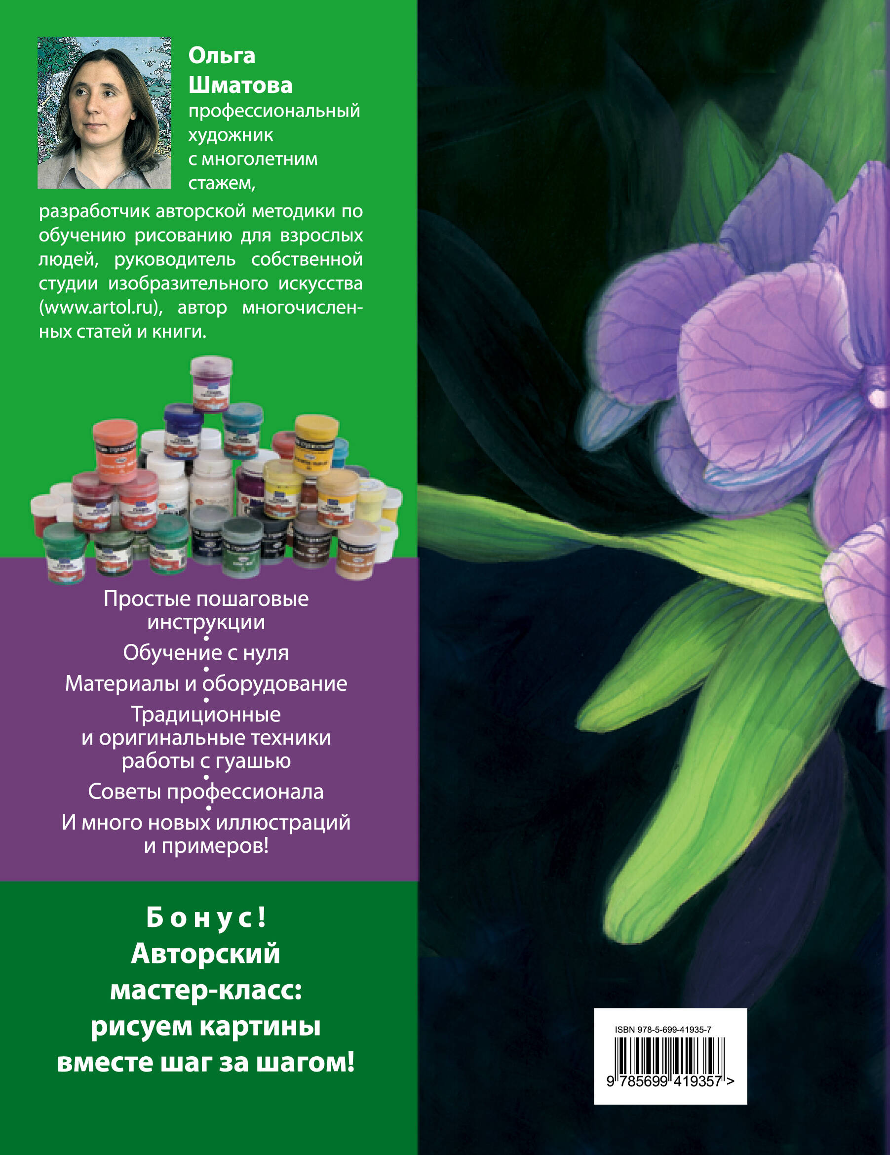 О чем Эта книга расскажет, как правильно выбрать материалы и оборудование, чтобы приступить к работе, какие существуют традиционные и оригинальные техники работы с гуашью, как поэтапно написать картину. Готовые приемы позволят начинающим художникам развиваться как творчески, так и технически, экономя время и силы для дальнейшего профессионального развития. Эффективная, наглядная и современная методика обучения направлена на раскрытие вашего природного потенциала и дает возможность овладеть простыми и доступными художественными навыками. Книга для тех, кто хочет: - овладеть авторскими приемами работы с гуашью; - использовать все живописные возможности, заложенные в гуаши; - ознакомиться с приемами опытного профессионала, настоящего мастера гуаши; - поднять свой профессиональный технический уровень. Об авторе Ольга Шматова - профессиональный художник, художественный руководитель студии обучения рисованию, автор более десятка книг-бестселлеров по обучению рисованию, издающихся в России и за рубежом. Фишки книги Рекордное количество приемов рисования гуашью. Обучение с нуля, шаг за шагом. Практичные советы, отсутствие лишних слов. Отзывы (все взято с Ozon.ru) «Отличная книга! Пока что у Ольги Шматовой других не было. Надеюсь, так будет и впредь...» «Второе издание можно смело называть другой книгой. Конечно, здесь есть общие темы, пересечение с предыдущей версией "Самоучителя по гуаши", но и прорва совершенно новых вещей. Приемов стало больше, кое-какие из них сами по себе стоят целой книги. Являюсь счастливым обладателем еще первого издания. Но, увидев второе, все равно его купил, поскольку второе издание - самостоятельная книга, очень мало дублирующая первую». - Доктор «Расписаны приемы от простого к сложному. Отдельно указаны ошибки. Все советы и ошибки подкреплены фотографиями или рисунками. Понравилось, что в конце каждого приема даются несложные задания для практики. Кроме того, в книге есть подробное пошаговое выполнение небольших картин. Пробовала на небольшом формате - очень мило». - Валентина «Спасибо, что такие книги вообще выпускают - замечательный помощник, можно даже преобразовать все методы для обучения в обычной школе». - Безотосная Ксюша «Наглядно, понятно, с кучей иллюстраций и пошаговых пояснений. Думаю, будет полезной для начинающих». - Андреева Ксения