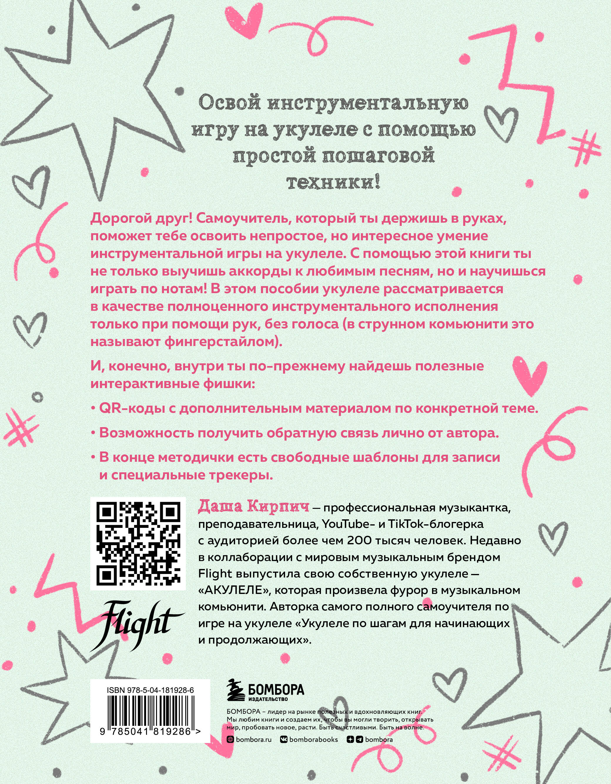 Укулеле - один из самых демократичных и доступных инструментов. И прежде всего он подкупает возможностью аккомпанировать любимым песням. Профессиональная музыкантка, блогерка и преподавательница Даша Кирпич расскажет тебе, как легко и быстро освоить инструментальную игру на укулеле. После изучения этой книги ты не только разучишь аккорды и ноты, но и узнаешь азы музыкальной теории, изучишь расположение нот на инструменте и выучишь сложные техники, баррэ, переборы и т.д. В конце книги, как и раньше, находятся словарь терминов и укутрекер для отслеживания прогресса. Даша Кирпич - профессиональная музыкантка, преподавательница, YouTube и TikTok блогерка с аудиторией более чем 200 тысяч человек. Недавно, в коллаборации с мировым музыкальным брендом Flight, выпустила свою собственную укулеле - «АКУЛЕЛЕ», которая произвела фурор в музыкальном комьюнити.| Издательство | ООО "Издательство "Эксмо" |