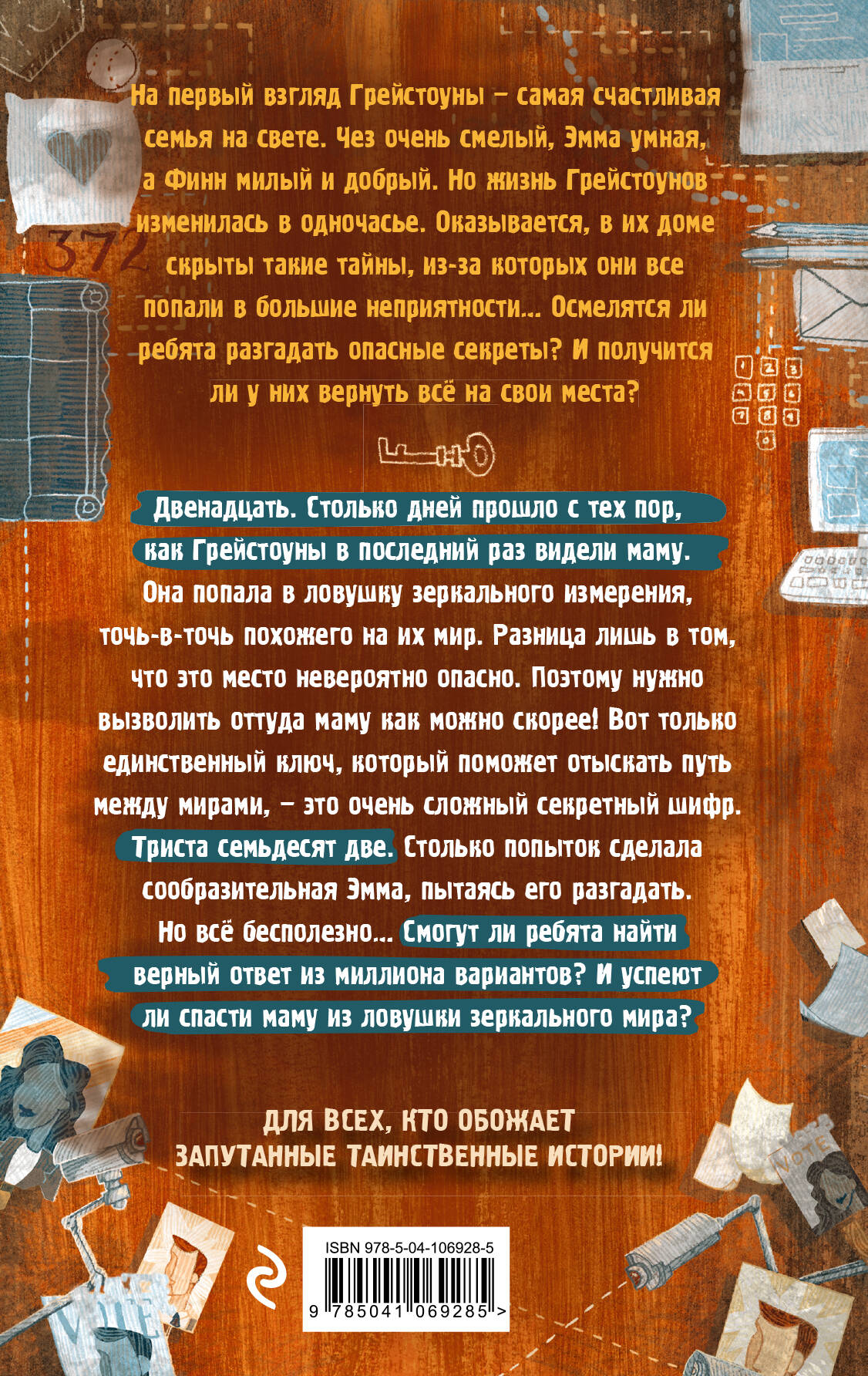 Двенадцать. Столько дней Грейстоуны не видели свою маму. Она попала в ловушку зеркального измерения, точь-в-точь похожего на их мир. Это место очень опасно, и нужно вызволить маму оттуда как можно скорее. Только вот единственная подсказка, которая поможет найти путь, - это сложный запутанный шифр. И даже сообразительная Эмма пока не смогла разгадать его… Смогут ли Грейстоуны отыскать путь между мирами? И получится ли у них спасти маму? Для всех, кто обожает запутанные таинственные истории в духе «Очень странных дел»! Приключение, полное интригующих секретов и непредсказуемых сюжетных поворотов. Как принимать себя таким, какой ты есть? Смелые главные герои помогут найти ответ на этот вопрос, волнующий многих подростков. «Мастерски построенный сюжет с таким количеством ошеломляющих поворотов, что вы не сможете остановиться, пока не дочитаете историю до конца. А потом попросите продолжение». - Шеннон Мессенджер, автор серии «Хранитель забытых городов»
