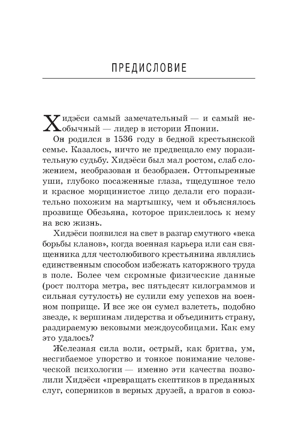 В разгар нескончаемого хаоса и кровопролития, когда единственным законом был закон меча, крестьянский мальчик Хидэёси мечтал стать самураем. Но для этого ему не хватало роста, силы и благородного происхождения. Добиться заветной цели он мог исключительно благодаря своему незаурядному уму. Старательно и вдумчиво постигая тонкости человеческой природы, он научился побеждать врагов не силой меча, а силой разума. Он сумел получить статус самурая, командовал армиями и в конце концов стал правителем всей страны. Что же помогало необразованному крестьянину подчинять своей воле, переманивать на свою сторону и подавлять сопротивление безжалостных военачальников? Как удавалось ему привлекать и удерживать тысячи преданных последователей?| Издательство | Попурри |