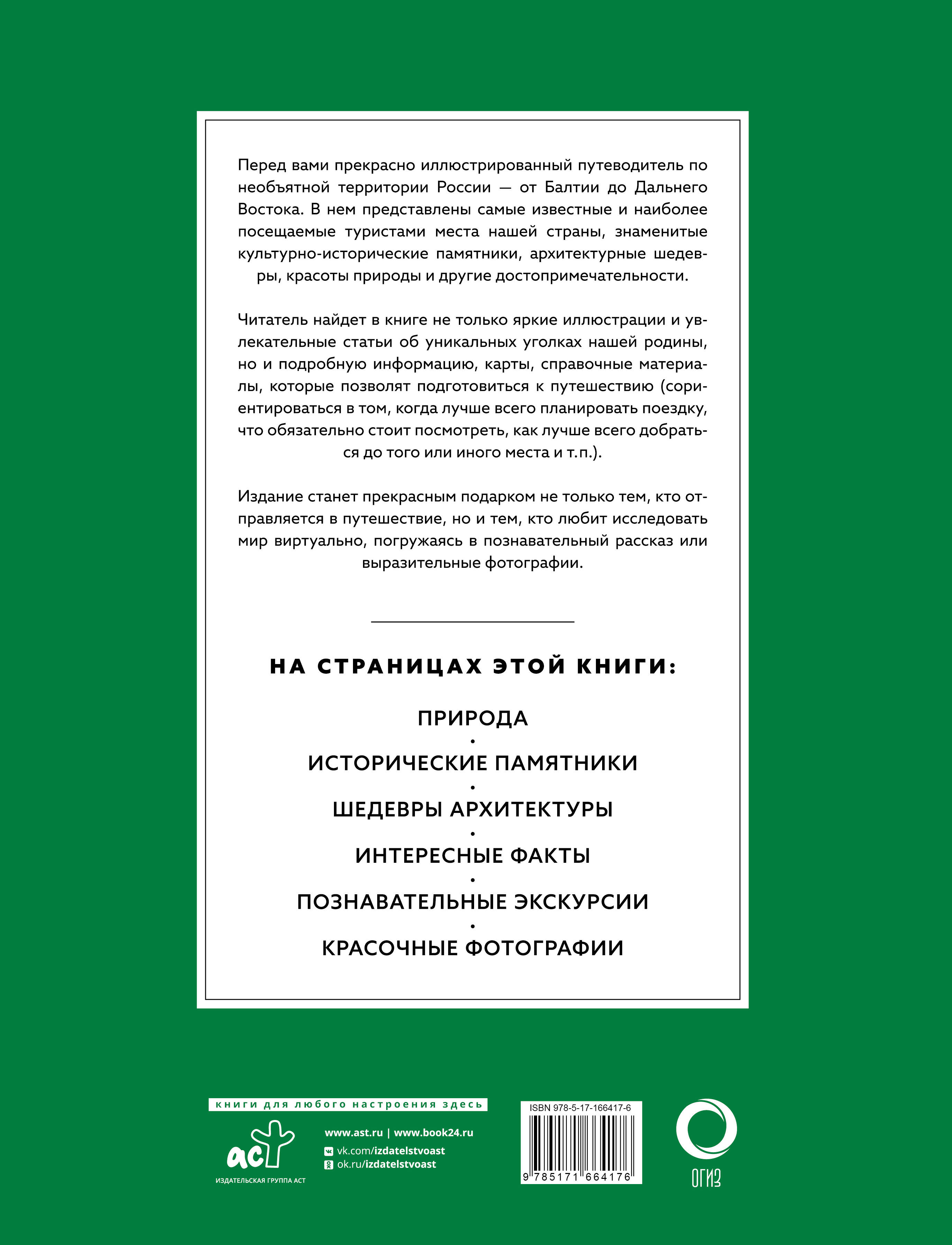 Перед вами прекрасно иллюстрированный путеводитель по необъятной территории России ─ от Балтии до Дальнего Востока. В нем представлены самые известные и наиболее посещаемые туристами места нашей страны, знаменитые культурно-исторические памятники, архитектурные шедевры, красоты природы и другие достопримечательности. Читатель найдет в книге не только яркие иллюстрации и увлекательные статьи об уникальных уголках нашей родины, но и подробную информацию, карты, справочные материалы, которые позволят подготовиться к путешествию (сориентироваться в том, когда лучше всего планировать поездку, что обязательно стоит посмотреть, как лучше всего добраться до того или иного места и т. п.). Издание станет прекрасным подарком не только тем, кто отправляется в путешествие, но и тем, кто любит исследовать мир виртуально, погружаясь в познавательный рассказ или выразительные фотографии. На страницах этой книги: • Природа • Исторические памятники • Шедевры архитектуры • Познавательные экскурсии • Красочные фотографии