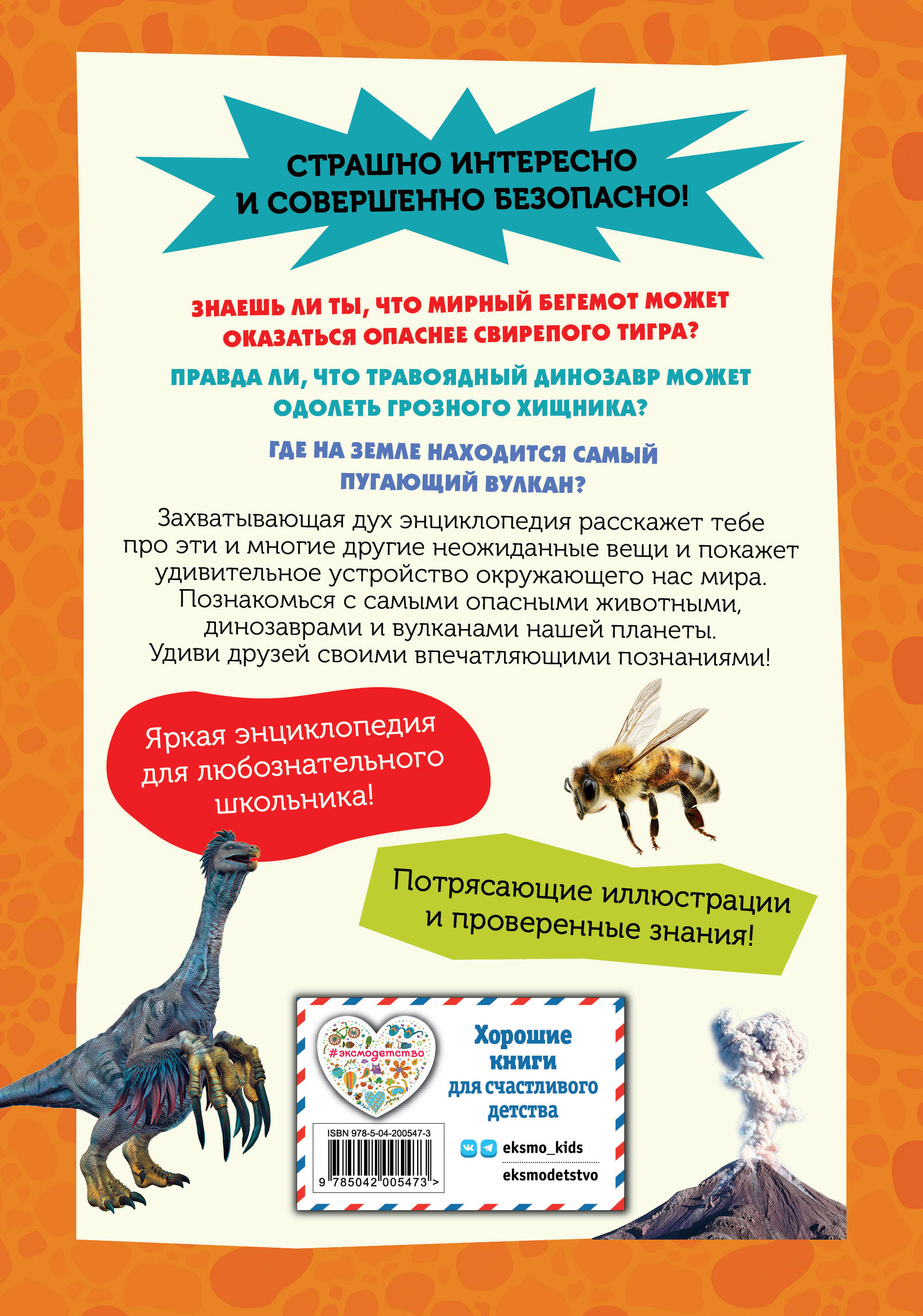 Эта красочная энциклопедия погрузит тебя в удивительный мир устрашающих и величественных динозавров, животных и вулканов. С безопасного расстояния восхитись красотой действующих «огнедышащих гор», могуществом доисторических ящеров и современных зверей и расширь свой кругозор, открывая для себя удивительные секреты окружающего мира. Знаешь ли ты, что мирный бегемот может оказаться опаснее свирепого тигра? Или что травоядный динозавр был способен одолеть грозного хищника? А где на Земле находится самый пугающий вулкан? Книга про динозавров, животных и природу ответит на эти и многие другие неожиданные вопросы, познакомит юного читателя с самыми грозными и невероятно любопытными существами нашей планеты. Большие красочные иллюстрации и фотографии, а также специальный крупный, легко читаемый текст делают познавательный процесс интересным и понятным. А занимательные тесты в конце каждой главы помогут закрепить полученные знания. Издание идеально подходит для детей младшего школьного возраста. Компактный формат энциклопедии позволит не только читать ее дома, но и носить с собой. Красочная увлекательная книга подходит для совместного изучения всей семьей и станет прекрасным подарком по любому поводу!| Издательство | ООО "Издательство "Эксмо" |