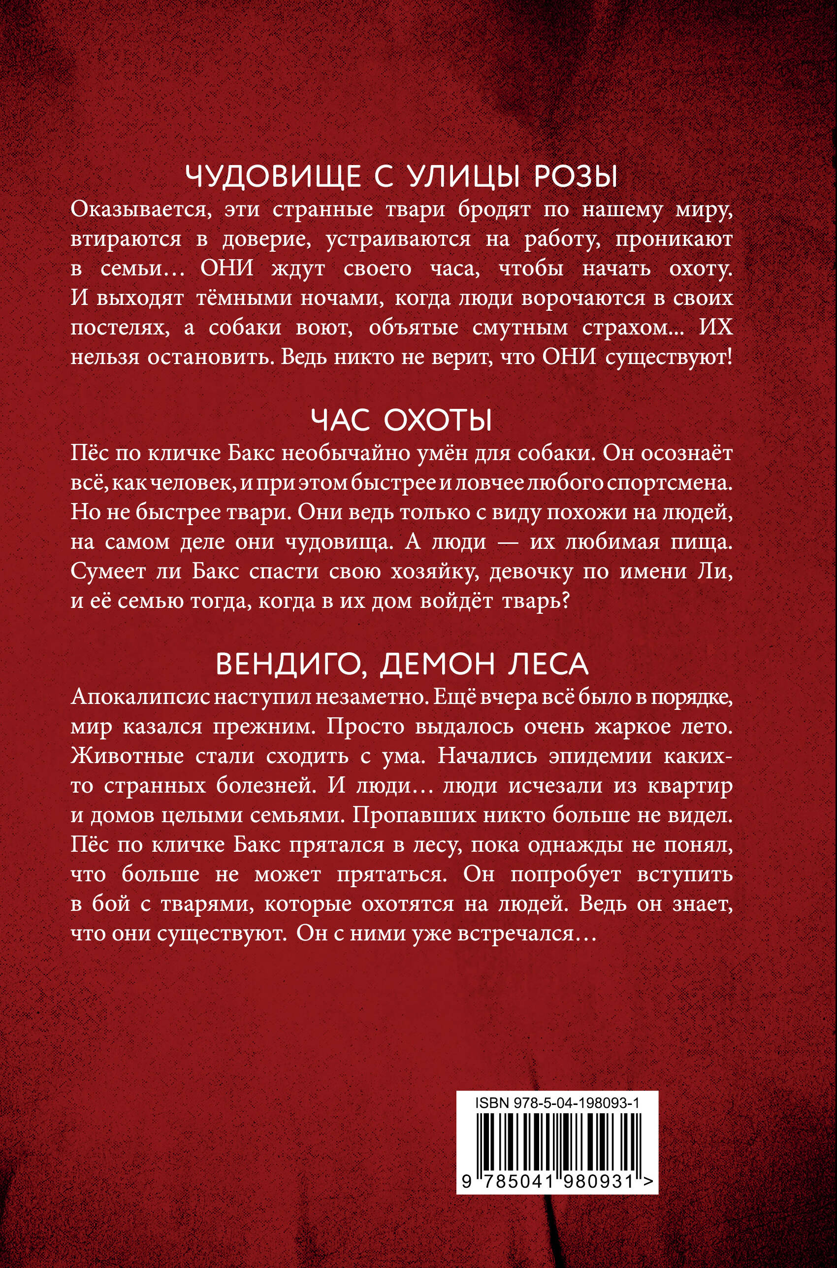 Первая книга в новой серии страшных историй для подростков. 3 повести под одной обложкой. История пса по кличке Бакс - и жутких хищников, которые умеют прикидываться людьми. Для читателей от 14 лет. «Чудовище с улицы Розы» Оказывается, эти странные твари бродят по нашему миру, втираются в доверие, проникают в семьи… ОНИ ждут своего часа, чтобы начать охоту. И выходят тёмными ночами, когда люди ворочаются в своих постелях, а собаки воют, объятые смутным страхом... ИХ нельзя остановить. Ведь никто не верит, что ОНИ существуют! «Час охоты» Пёс по кличке Бакс необычайно умён для собаки. Он осознаёт всё, как человек, и при этом быстрее и ловчее любого спортсмена. Но не быстрее твари. Они ведь только с виду похожи на людей, на самом деле они чудовища. А люди - их любимая пища. Сумеет ли Бакс спасти свою хозяйку, девочку по имени Ли, и её семью тогда, когда в их дом войдёт тварь? «Вендиго, демон леса» Апокалипсис наступил незаметно. Ещё вчера всё было в порядке, мир казался прежним. Просто выдалось очень жаркое лето. Животные стали сходить с ума. Начались эпидемии каких-то странных болезней. И люди… люди исчезали из квартир и домов целыми семьями. Пропавших никто больше не видел. Пёс по кличке Бакс прятался в лесу, пока однажды не понял, что больше не может прятаться. Он попробует вступить с тварями, которые охотятся на людей, в бой. Ведь он знает, что они существуют. Он с ними уже встречался…| Издательство | ООО "Издательство "Эксмо" |