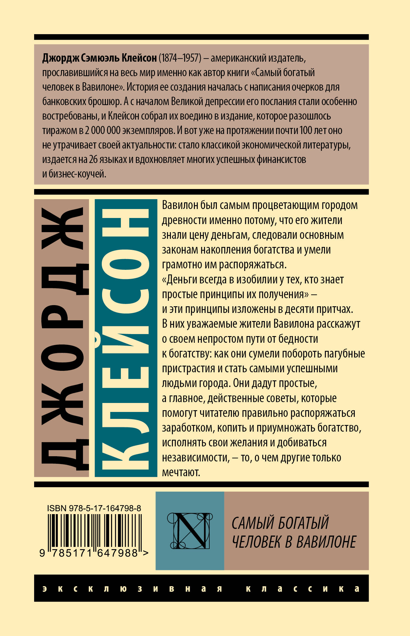 Вавилон был самым процветающим городом древности именно потому, что его жители знали цену деньгам, следовали основным принципам накопления богатства и умели грамотно им распоряжаться. "Деньги всегда в изобилии у тех, кто знает простые принципы их получения" - и эти принципы изложены в десяти притчах. В них уважаемые жители Вавилона расскажут о своем непростом пути от бедности к богатству: как они сумели побороть пагубные пристрастия и стать самыми успешными людьми города. Они дадут простые, а главное, действенные советы, которые помогут читателю правильно распоряжаться заработком, копить и приумножать богатство, исполнять свои желания и добиваться независимости - то, о чем другие только мечтают.| Издательство | Издательство "АСТ" |