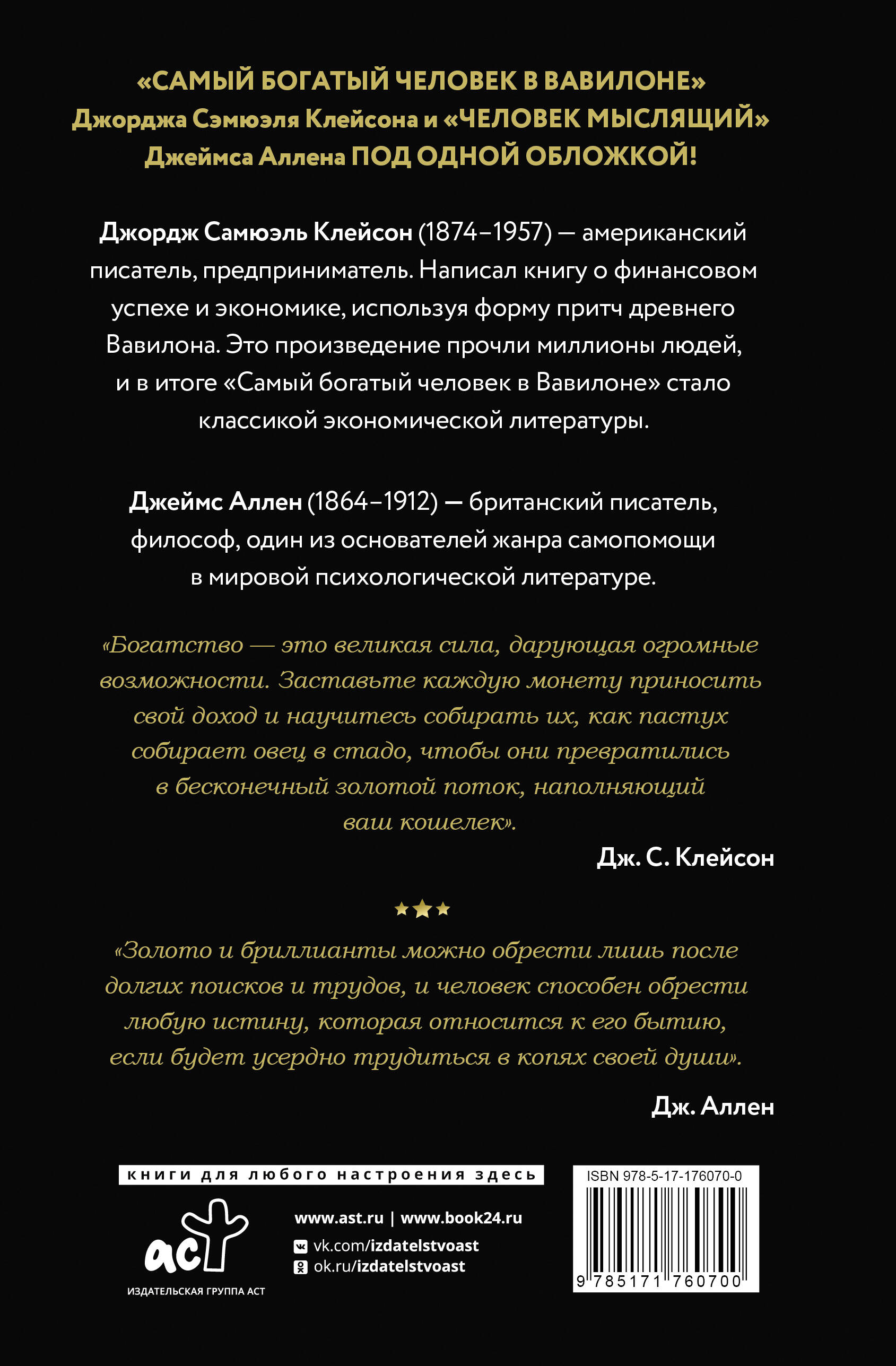 Сборник из двух классических произведений, которые уже многие десятилетия помогают изменить свою жизнь, обрести финансовую стабильность и внутреннюю гармонию: "Самый богатый человек в Вавилоне" Джорджа Клейсона и "Человек мыслящий" Джеймса Аллена. Эти книги дают возможность максимально глубоко проработать тему денег, научится правильно зарабатывать, тратить, и думать о деньгах. После прочтения вы не только начнете лучше управлять своими финансами, но и поймете, как ваши мысли формируют реальность. Знаменитые "Вавилонские притчи" Джорджа Клейсона - величайшее из всех произведений на тему финансового планирования и личного богатства, Библия процветания, которая поможет вам понять законы движения, накопления и сохранения денежного капитала. В книге "Человек мыслящий. 8 столпов процветания" Джеймс Аллен исследует силу мысли и ее влияние на формирование характера и судьбы человека. Автор подчеркивает, что управление собственным мышлением является ключом к достижению личного и профессионального успеха. Аллен выделяет восемь основополагающих принципов процветания, соблюдение которых ведет к гармонии и благополучию в жизни.| Издательство | Издательство "АСТ" |