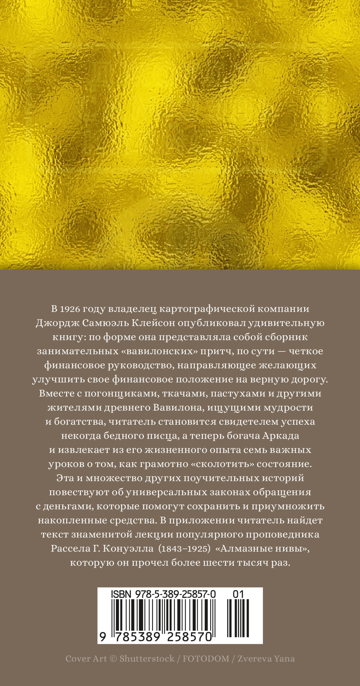 Путь к богатству ясен и прям, за тысячелетия немало людей прошли по нему и достигли благополучия. Если не пренебрегать их мудростью и усвоить золотые правила, этим путем может проследовать каждый. В 1926 году владелец картографической компании Джордж Самюэль Клейсон опубликовал удивительную книгу: по форме она представляла собой сборник занимательных "вавилонских" притч, по сути - четкое финансовое руководство, направляющее желающих улучшить свое финансовое положение на верную дорогу. Вместе с погонщиками, ткачами, пастухами и другими жителями древнего Вавилона, ищущими мудрости и богатства, читатель становится свидетелем успеха некогда бедного писца, а теперь богача Аркада и извлекает из его жизненного опыта семь важных уроков о том, как грамотно "сколотить" состояние. Эта и множество других поучительных историй повествуют об универсальных законах обращения с деньгами, которые помогут сохранить и приумножить накопленные средства. Книга публикуется в новом переводе. В приложении читатель найдет текст знаменитой лекции популярного проповедника Рассела Г. Конуэлла (1843-1925) "Алмазные нивы", которую он прочел более шести тысяч раз.| Издательство | Азбука-Аттикус Издат.группа ООО |