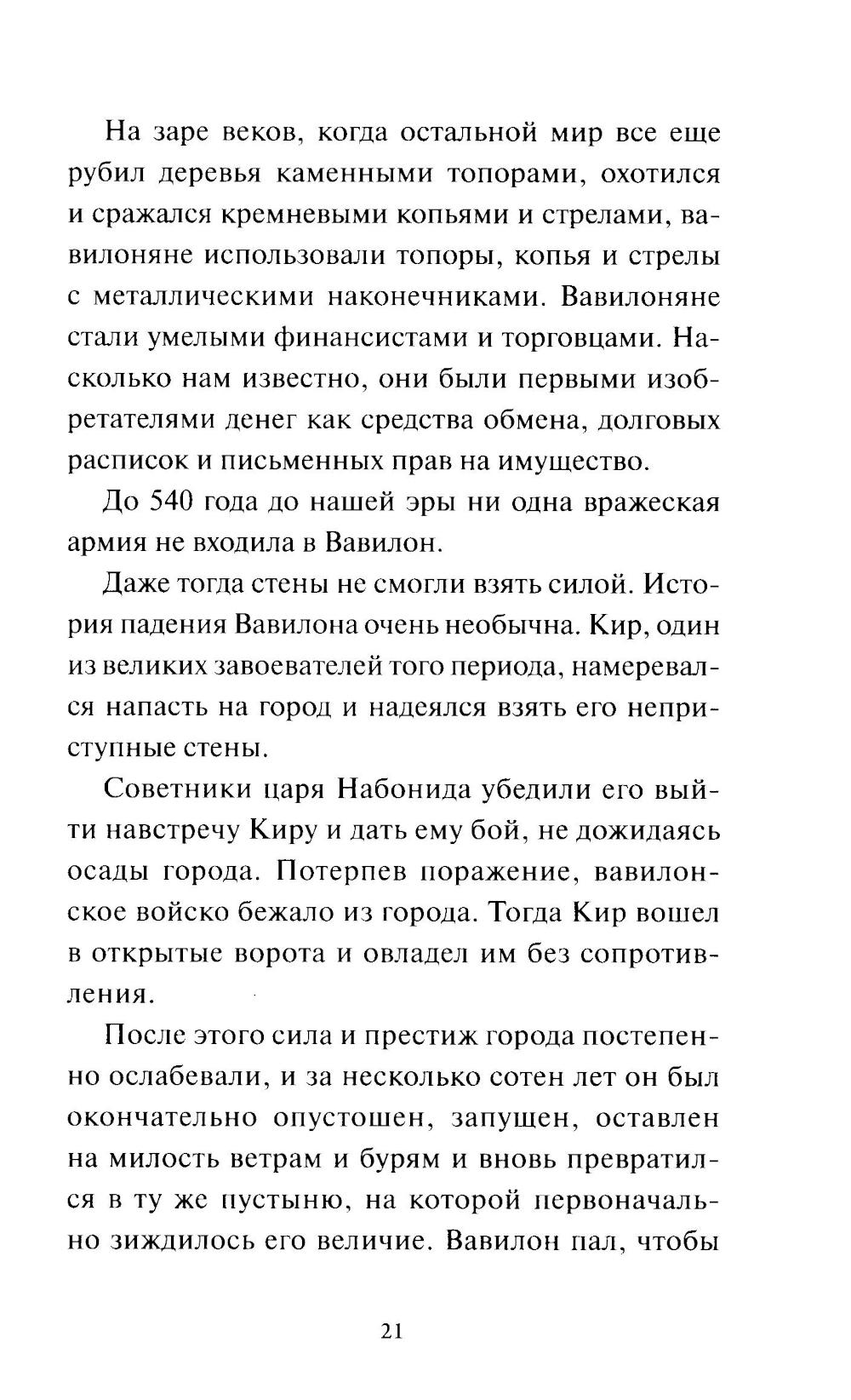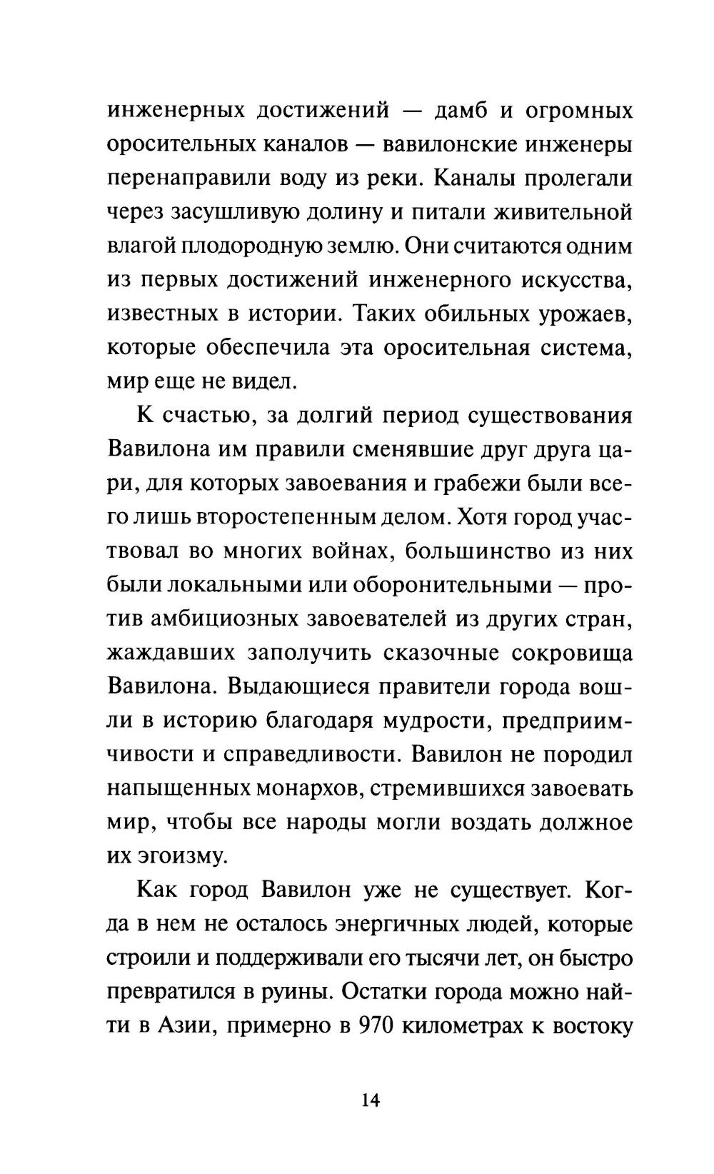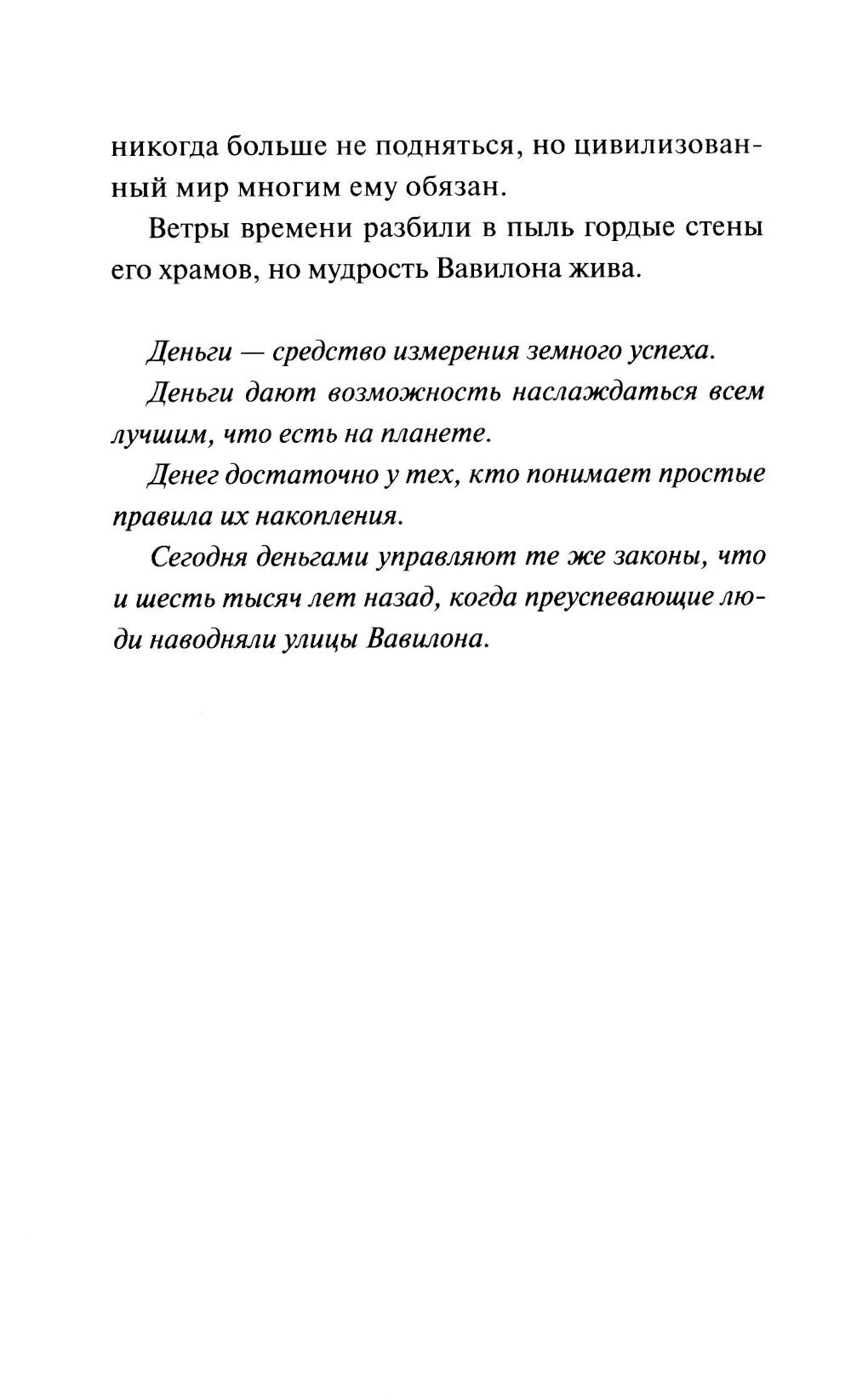 Опубликованная в 1926 году, эта книга перевернула представление о деньгах и разошлась по миру миллионными тиражами. Вавилон стал самым богатым городом древности благодаря своим жителям: они умели ценить деньги, разумно обращаться с ними и заставлять работать на себя. Прошли тысячелетия, но эти принципы остаются неизменными - именно на них держится искусство управления деньгами и сегодня. Писатель и основатель картографической компании Джордж Клейсон опирался на древние клинописные таблички, найденные в Месопотамии и относящиеся к вавилонской эпохе. На них были записаны советы и наблюдения торговцев, ростовщиков и деловых людей того времени. Достоверность источников подтверждена Британской ассоциацией археологов: Клейсон неоднократно обращался к ее специалистам за помощью в расшифровке найденных фрагментов. Мудрые и простые притчи раскрывают семь вечных законов обращения с деньгами - основу финансового благополучия для любого человека.| Издательство | Манн, Иванов и Фербер |