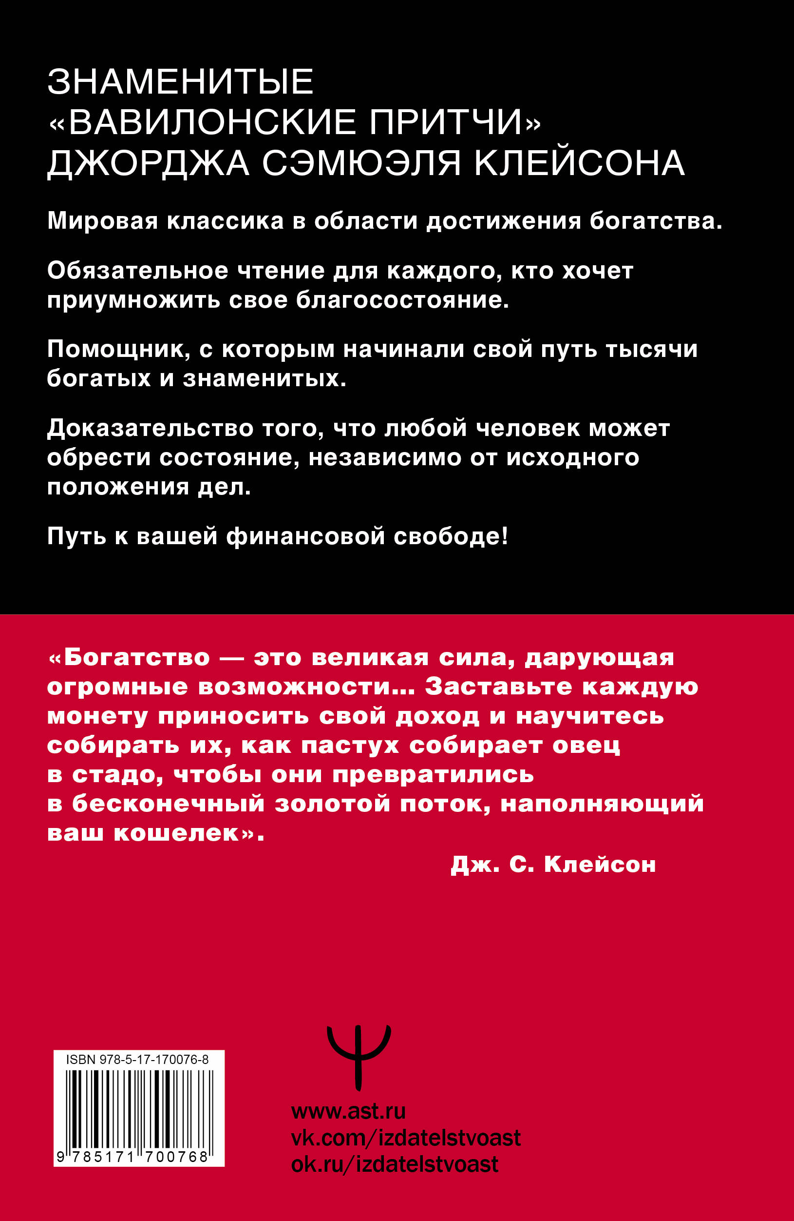 Перед вами - мировая классика в области достижения богатства. Обязательна к прочтению для каждого, кто хочет приумножить свое благосостояние, Помощник, с которым начинали свой путь тысячи богатых и знаменитых. Знаменитые "Вавилонские притчи" Джорджа Клейсона - величайшее из всех вдохновляющих произведений на тему финансового планирования и личного богатства, это Библия процветания, которая будет поддерживать вас на протяжении всей жизни. Эта книга - путь к вашей финансовой свободе!| Издательство | Издательство "АСТ" |