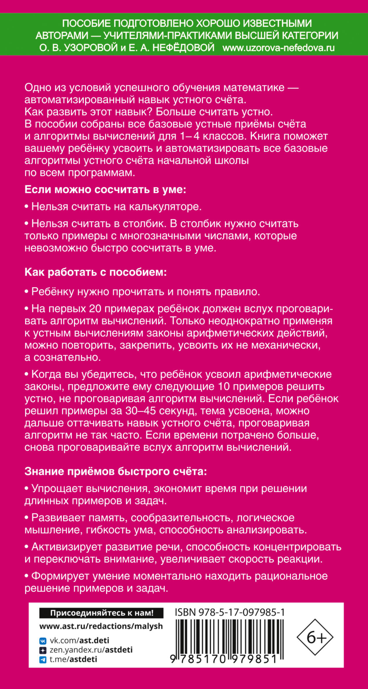 Книга известных педагогов О.В. Узоровой и Е.А. Нефёдовой эффективна для отработки вычислительных навыков. Книга адресована учащимся начальных классов и окажет неоценимую помощь в освоении программы начальной школы. - Задания с цепочками закрепляют правила выполнения простых математических действий. - Автоматизация навыка счета упрощает математические вычисления и логические операции, а также облегчает дальнейшее обучение математике. - Регулярные занятия помогут научить ребенка быть внимательным, сообразительным, вдумчивым - тогда он сможет успевать по математике на отлично.