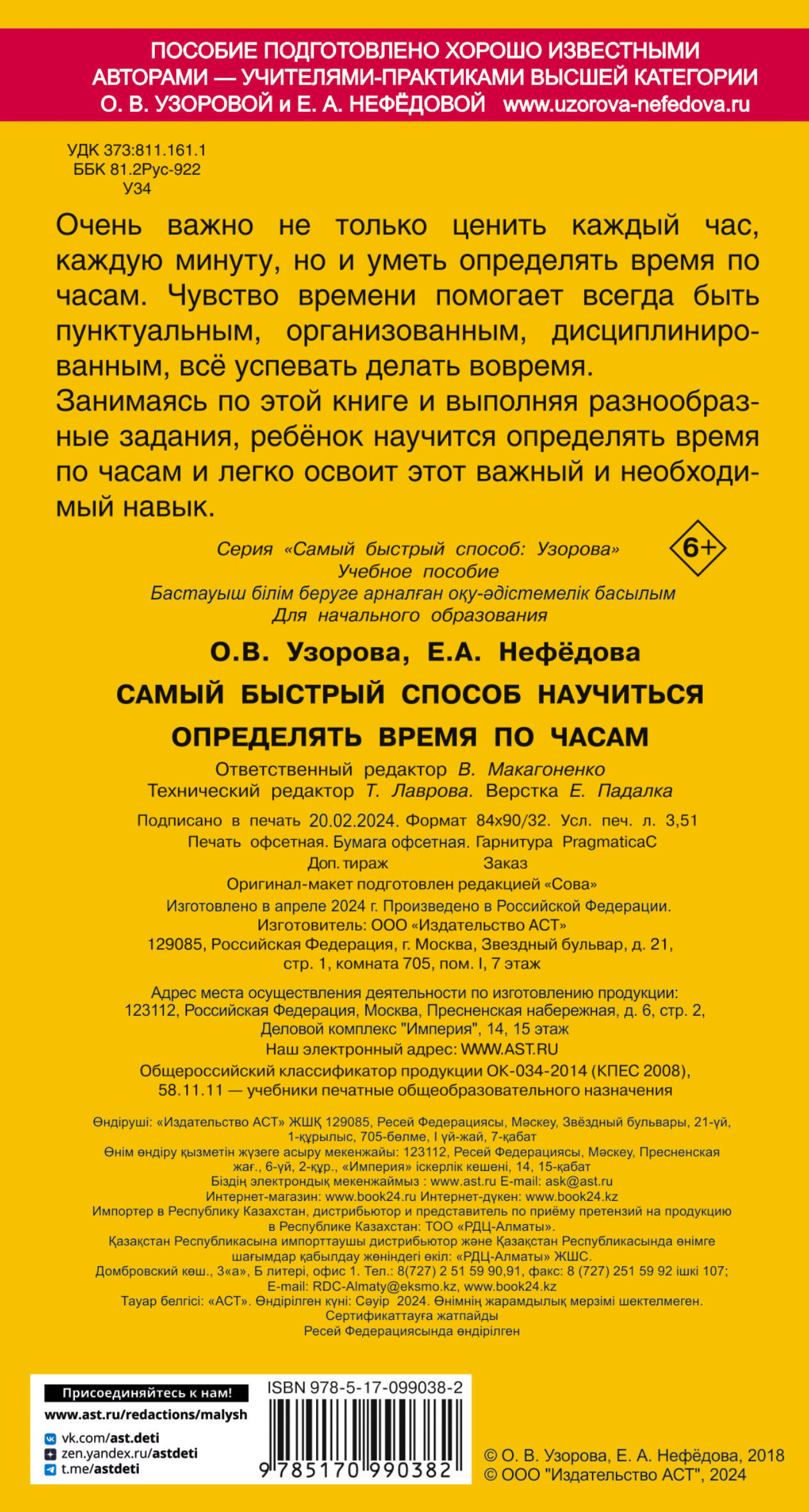 О чем эта книга В пособии известных педагогов-практиков О. В. Узоровой и Е. А. Нефёдовой предложены разнообразные задания, которые помогут научиться легко определять время по часам. Для кого Для заботливых родителей и старательных учеников. Каковы особенности этой книги - Очень важно не только ценить каждый час, каждую минуту, но и уметь определять время по часам. - Занимаясь по этой книге и выполняя разнообразные задания, ребёнок научится определять время по часам и легко освоит этот навык. - Высокоэффективный учебный тренинг базируется на современных методиках. - Пособие можно использовать на уроках математики в школе и для занятий дома.| Издательство | ИЗДАТЕЛЬСТВО "АСТ" |