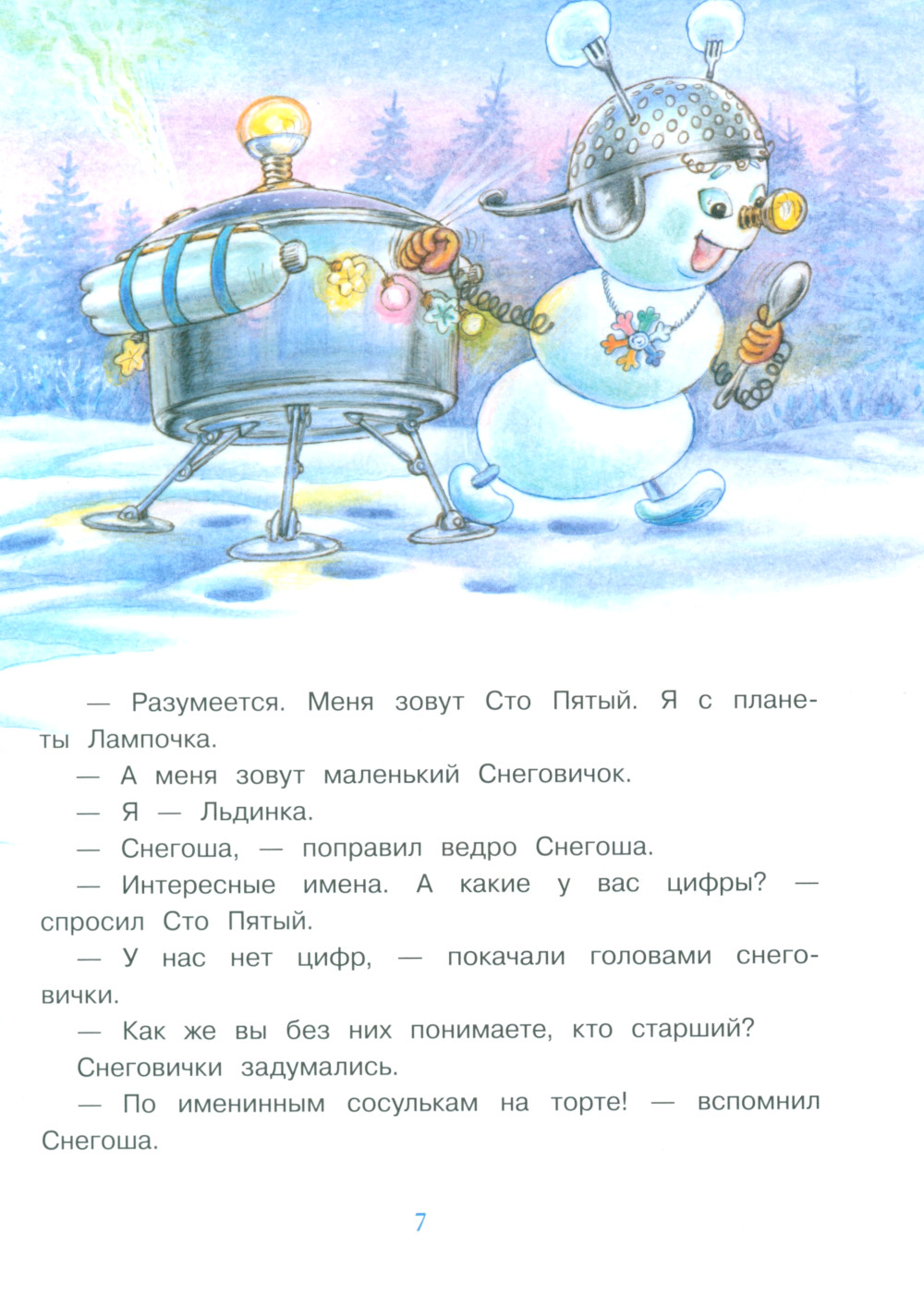 Даже опытным искателям приключений бывает сложно найти что-то новое и необычное. И тогда приключения находят их сами... Снеговичок, Льдинка и Снегоша перед Новым годом отправились за хлебом. И прямо перед их носом приземлилась космическая летающая кастрюля! Друзья очень обрадовались звездному гостю! Он пригласил их к себе на корабль и рассказал, что снеговики живут на многих планетах, которые называются по носам снеговиков. Планета, на которой живут наши друзья снеговички, оказывается, называется Морковка. А сам космический пришелец - с планеты Лампочка. И пока маленький Снеговичок и Льдинка знакомились с удивительным изобретением под названием «компьютер», любопытный Снегоша решил нажать на странную желтую кнопку. И тут случилось неожиданное: крышка захлопнулась и кастрюля взмыла в небо! Куда летят снеговички? Как им теперь вернуться домой? Ведь скоро Новый год! Эта книга Татьяны Коваль входит в серию «Детская художественная литература». Книга для детей дошкольного возраста Художник А. Чукавин| Издательство | Стрекоза |