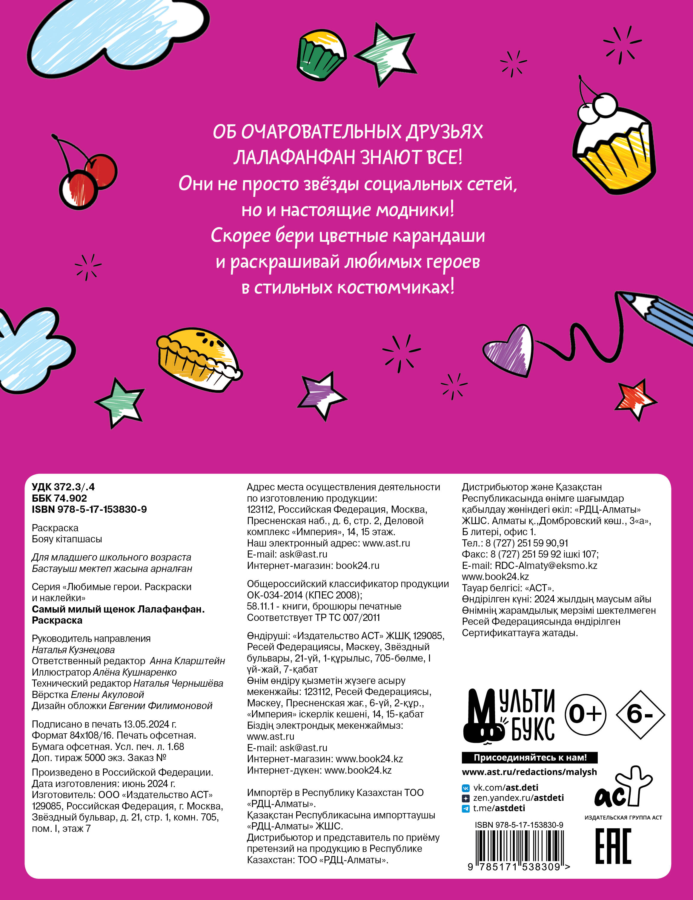 ОБ ОЧАРОВАТЕЛЬНОЙ УТОЧКЕ ЛАЛАФАНФАН И ЕЁ ДРУЗЬЯХ ЗНАЮТ ВСЕ! Они не просто звёзды социальных сетей, но и настоящие модники! Скорее бери цветные карандаши и раскрашивай любимых героев в стильных костюмчиках!| Издательство | ИЗДАТЕЛЬСТВО "АСТ" |
