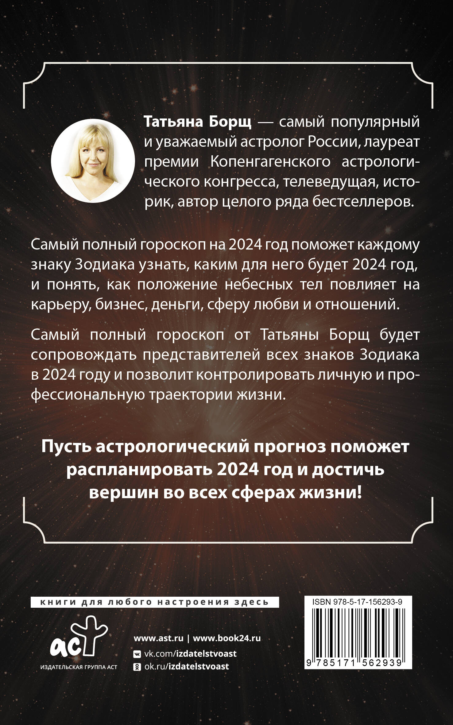 Татьяна Борщ - самый популярный и уважаемый астролог России, лауреат премии Копенгагенского астрологического конгресса, телеведущая, историк, автор целого ряда бестселлеров. Cамый полный гороскоп на 2024 год поможет каждому знаку Зодиака узнать, каким для него будет 2024 год, и понять, как положение небесных тел повлияет на карьеру, бизнес, деньги, сферу любви и отношений. Самый полный гороскоп от Татьяны Борщ будет сопровождать представителей всех знаков Зодиака в 2024 году и позволит контролировать личную и профессиональную траектории жизни. Пусть астрологический прогноз поможет распланировать 2024 год и достичь вершин во всех сферах жизни!| Издательство | ИЗДАТЕЛЬСТВО "АСТ" |