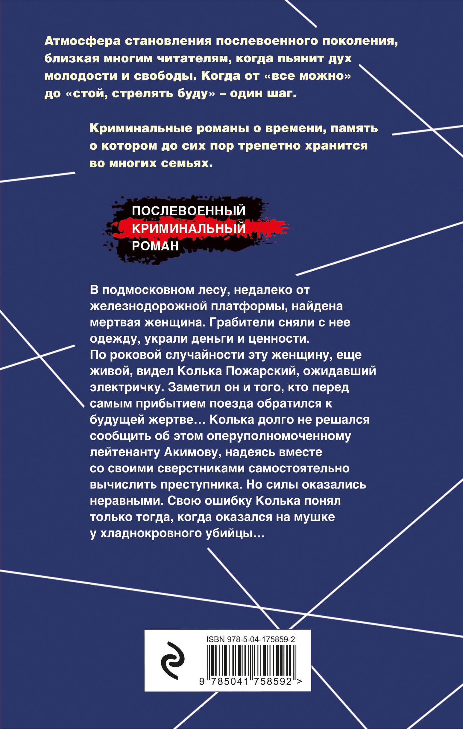 Атмосфера становления послевоенного поколения, близкая многим читателям, когда пьянит дух молодости и свободы. Когда от «все можно» до «стой, стрелять буду» - один шаг. Криминальные романы о времени, память о котором до сих пор трепетно хранится во многих семьях. Персонажи, похожие на культовые образы фильма «Прощай, шпана замоскворецкая». В подмосковном лесу недалеко от железнодорожной платформы найдена мертвая женщина. Грабители сняли с нее одежду, украли деньги и ценности. По роковой случайности эту женщину, еще живой, видел Колька Пожарский, ожидавший электричку. Заметил он и того, кто перед самым прибытием поезда обратился к будущей жертве… Колька долго не решался сообщить об этом оперуполномоченному лейтенанту Акимову, надеясь вместе со своим сверстниками самостоятельно вычислить преступника. Но силы оказались неравными. Свою ошибку Колька понял только тогда, когда оказался на мушке хладнокровного убийцы…| Издательство | ООО "Издательство "Эксмо" |