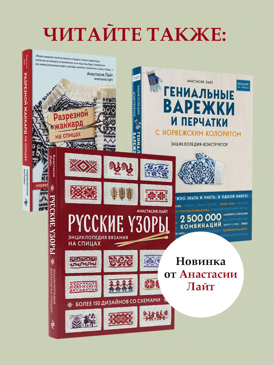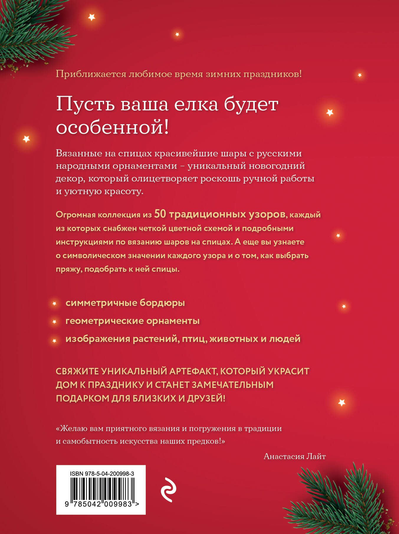 «Желаю вам приятного вязания и погружения в традиции и самобытность искусства наших предков!» - Анастасия Лайт Приближается любимое время зимних праздников! Пусть ваша елка будет особенной! Вязанные на спицах красивейшие шары с русскими народными орнаментами - уникальный новогодний декор, который не только олицетворяет роскошь ручной работы и уютную красоту, но и защитит ваших близких, принесет в дом счастье и успех, мир и благополучие. Русские узоры мы привыкли видеть в вышивке, а вот вязанными на спицах не встречали почти никогда! Пришло время исправить эту несправедливость и немного «подвинуть» поднадоевшие скандинавские дизайны! И самое время это сделать в праздники, когда особенно хочется удивлять! 50 пушистых узорных шаров на вашей елке! С самыми разными разноцветными узорами, при взгляде на которые теплеет на сердце. Они такие знакомые, родные, и в то же время необычные. К каждому узору в книге есть схема, а еще, для начинающих, предусмотрен краткий курс по вязанию шаров. Сделайте вашу елку особенной!| Издательство | ООО "Издательство "Эксмо" |