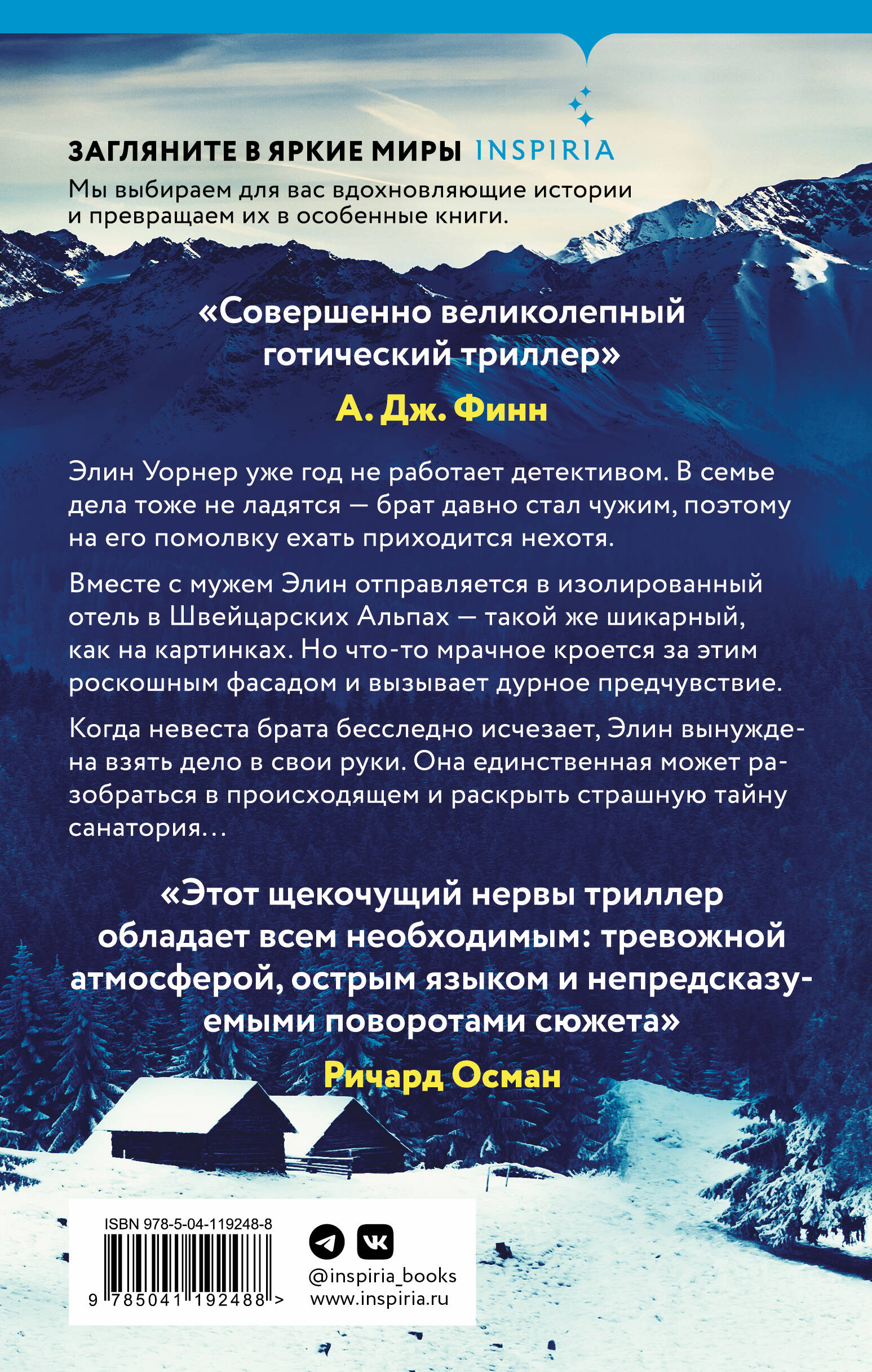 Элин Уорнер уже год не работает детективом. В семье дела тоже не ладятся - брат давно стал чужим, поэтому на его помолвку ехать приходится нехотя. Вместе с мужем Элин отправляется в изолированный отель в Швейцарских Альпах - такой же шикарный, как на картинках. Но что-то мрачное кроется за этим роскошным фасадом и вызывает дурное предчувствие. Когда невеста брата бесследно исчезает, Элин вынуждена взять дело в свои руки. Она единственная может разобраться в происходящем и раскрыть страшную тайну санатория... Представьте себе книгу, которую Стивен Кинг и Агата Кристи написали вместе. Результат - идеальный готический триллер, полный умных загадок и тревожной атмосферы.| Издательство | ООО "Издательство "Эксмо" |