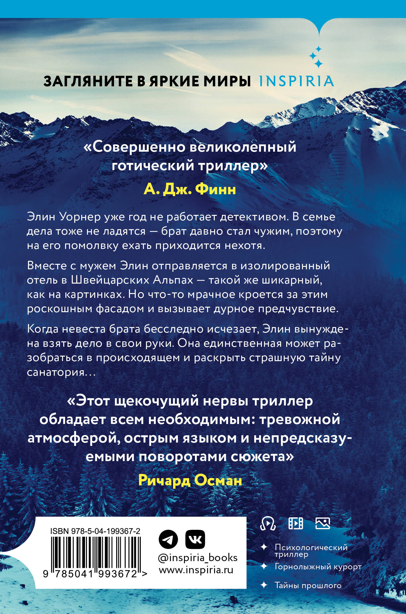 Элин Уорнер уже год не работает детективом. В семье дела тоже не ладятся - брат давно стал чужим, поэтому на его помолвку ехать приходится нехотя. Вместе с мужем Элин отправляется в изолированный отель в Швейцарских Альпах - такой же шикарный, как на картинках. Но что-то мрачное кроется за этим роскошным фасадом и вызывает дурное предчувствие. Когда невеста брата бесследно исчезает, Элин вынуждена взять дело в свои руки. Она единственная может разобраться в происходящем и раскрыть страшную тайну санатория... Представьте себе книгу, которую Стивен Кинг и Агата Кристи написали вместе. Результат - идеальный готический триллер, полный умных загадок и тревожной атмосферы.| Издательство | ООО "Издательство "Эксмо" |