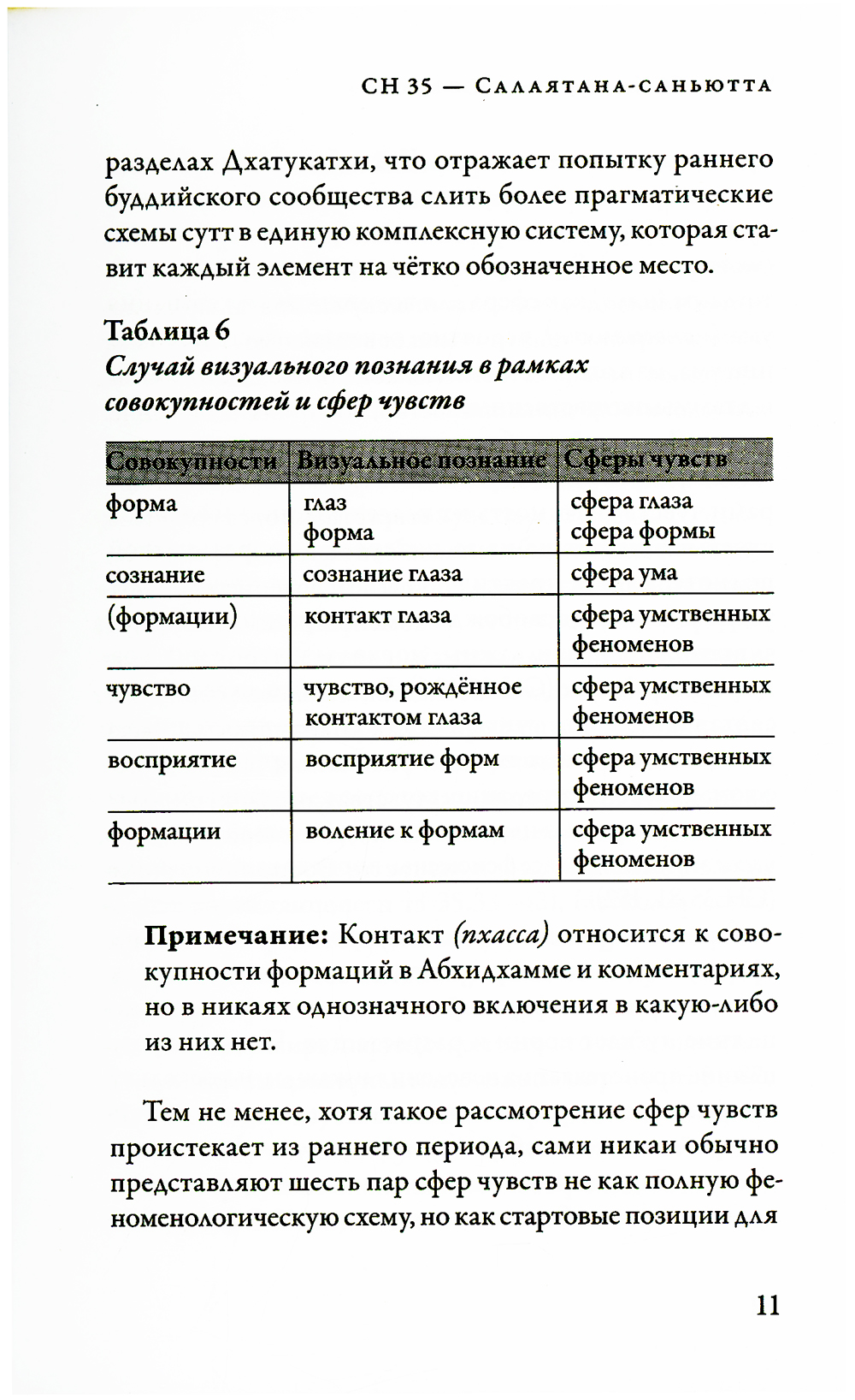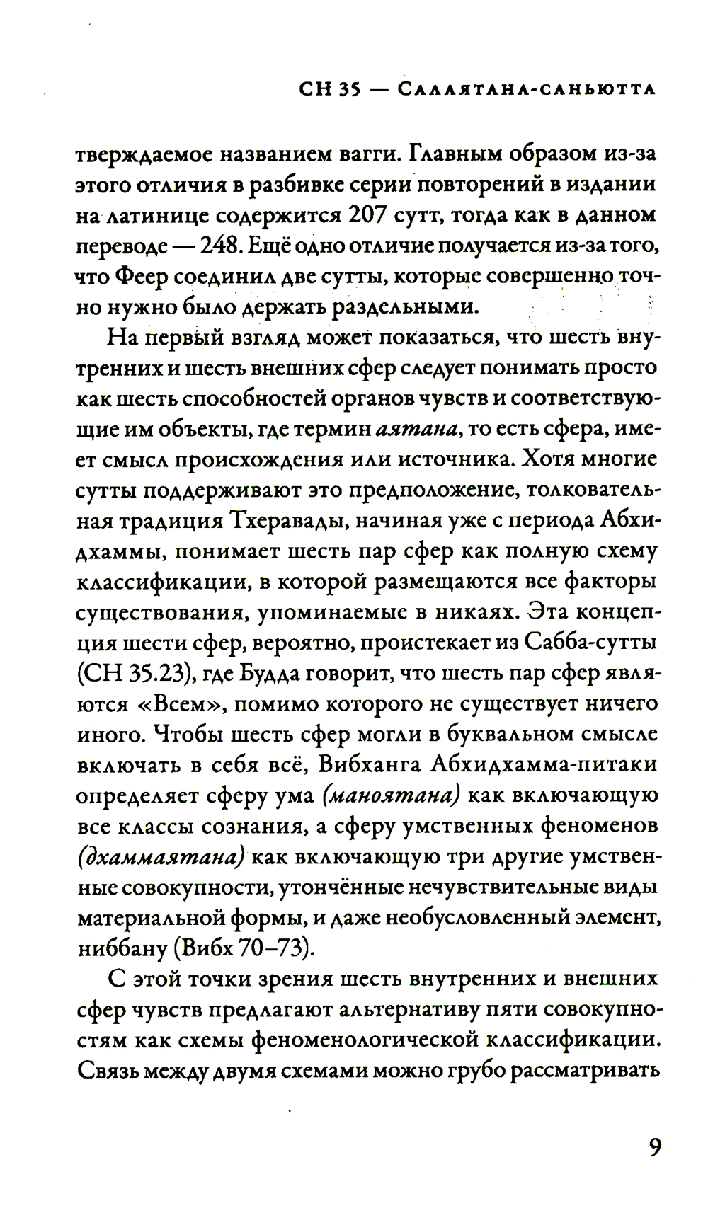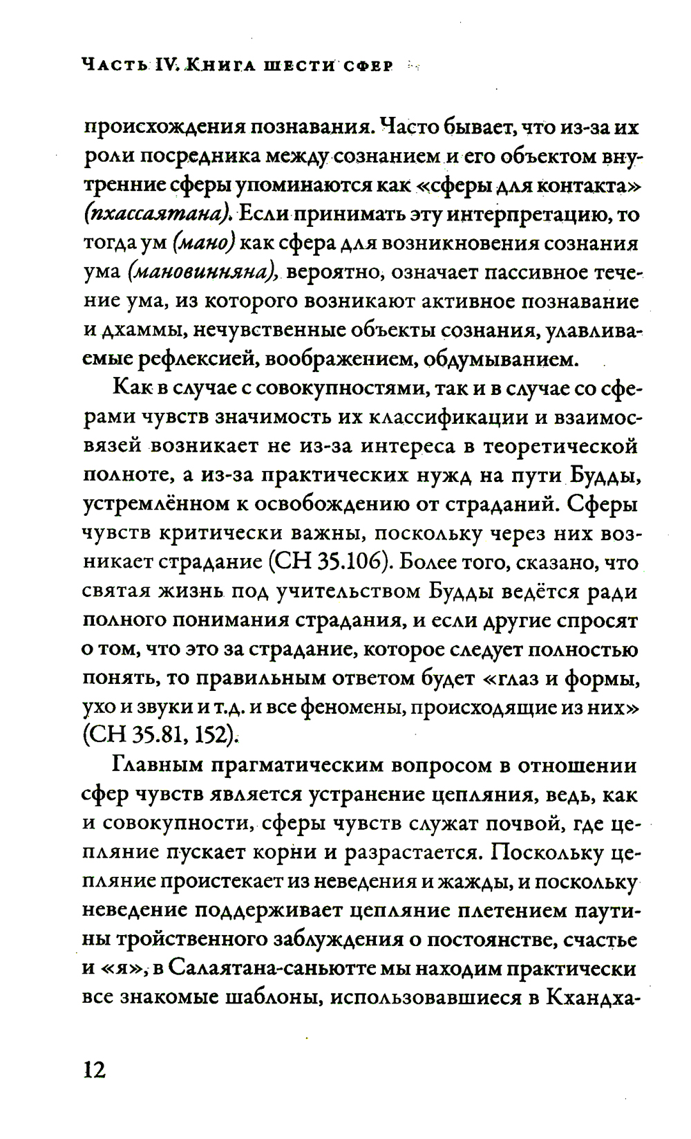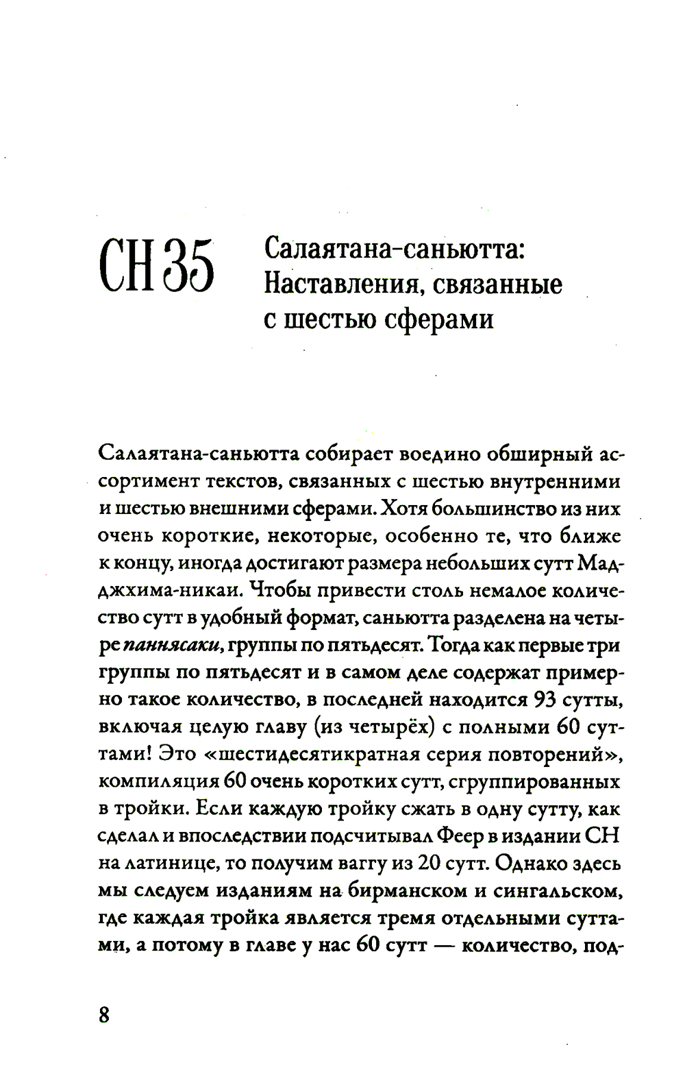 Это третье из четырёх больших собраний Сутта-питаки Палийского канона.Четвёртая книга, как и предыдущая, рассматривает чувственное существование, но в этот раз с другой перспективы, обращаясь к таким концепциям как шесть внутренних и шесть внешних сфер чувств. Они представляют собой все познающие способности человека и соответствующие им познаваемые объекты. Кроме этой основной темы в Книге шести сфер затронуты и другие. Среди этих текстов особый интерес представляют сутты о достигшем высоких духовных вершин домохозяине Читте, беседы с начальниками, факты о женщинах.