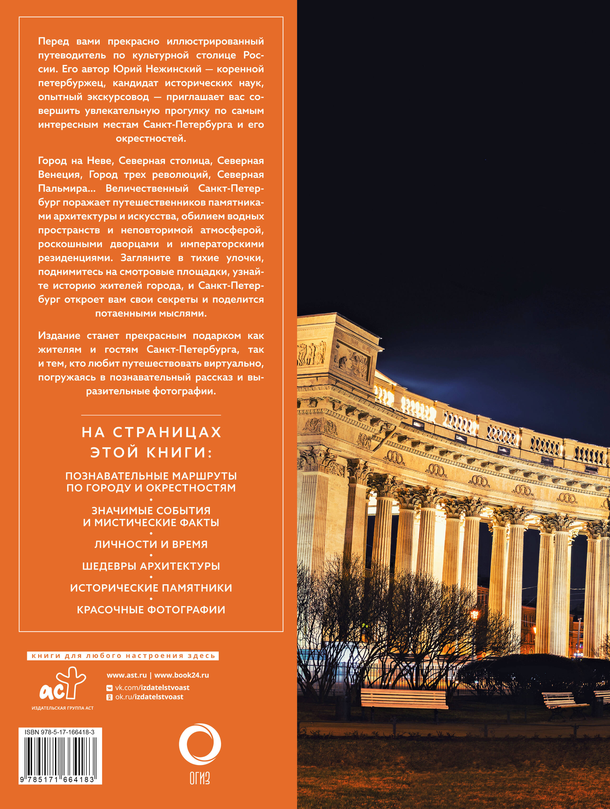 Перед вами прекрасно иллюстрированный путеводитель по культурной столице России. Его автор Юрий Нежинский - коренной петербуржец, кандидат исторических наук, опытный экскурсовод - приглашает вас совершить увлекательную прогулку по самым интересным местам Санкт-Петербурга и его окрестностей. Город на Неве, Северная столица, Северная Венеция, Город трех революций, Северная Пальмира... Величественный Санкт-Петербург поражает путешественников памятниками архитектуры и искусства, обилием водных пространств и неповторимой атмосферой, роскошными дворцами и императорскими резиденциями. Загляните в тихие улочки, поднимитесь на смотровые площадки, узнайте историю жителей города, и Санкт-Петербург откроет вам свои секреты и поделится потаенными мыслями. Издание станет прекрасным подарком как жителям и гостям Санкт-Петербурга, так и тем, кто любит путешествовать виртуально, погружаясь в познавательный рассказ и выразительные фотографии. На страницах этой книги: • Познавательные маршруты по городу и окрестностям • Значимые события и мистические факты • Личности и время • Шедевры архитектуры • Исторические памятники • Красочные фотографии