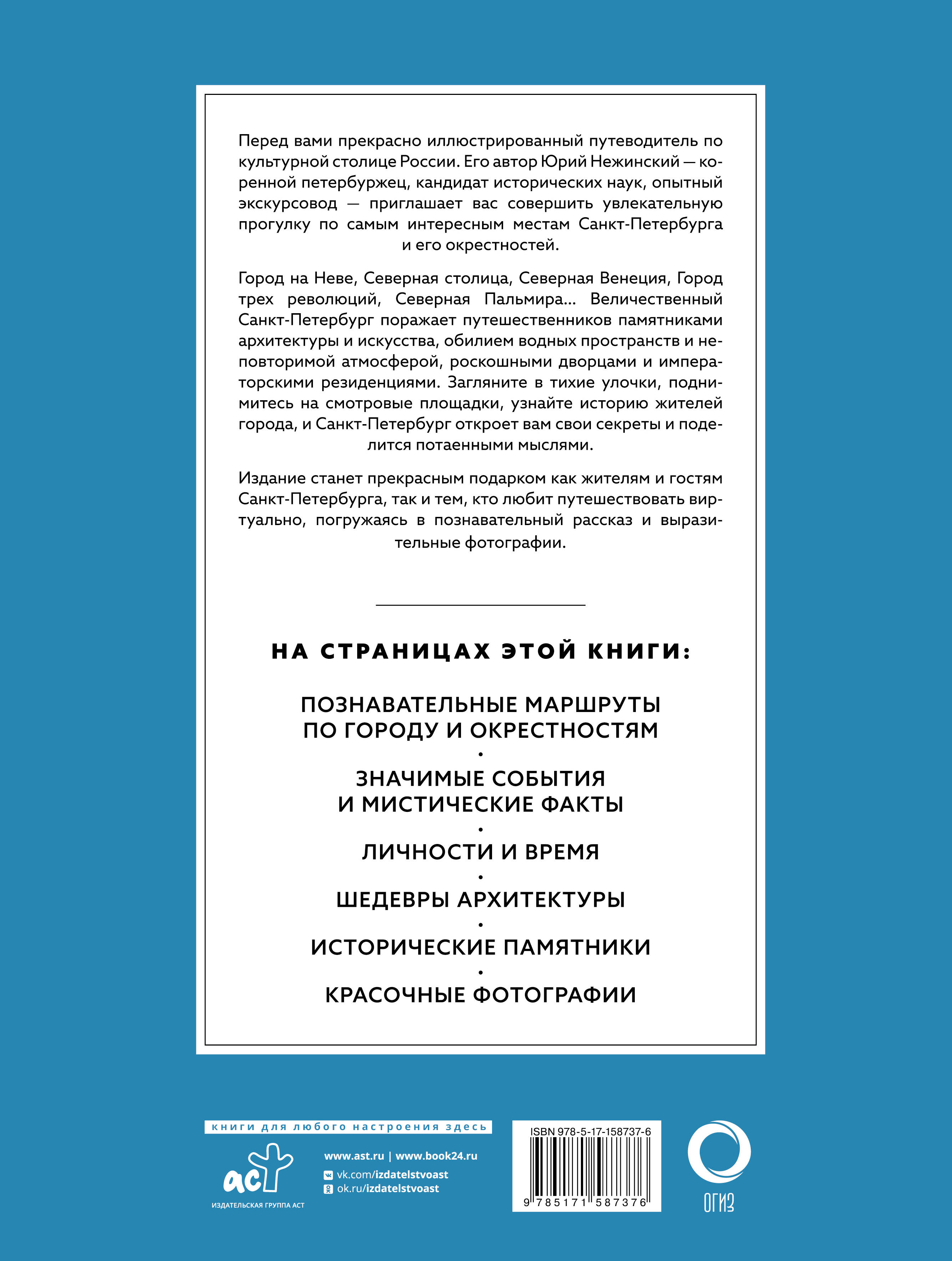 Перед вами прекрасно иллюстрированный путеводитель по культурной столице России. Его автор Юрий Нежинский - коренной петербуржец, кандидат исторических наук, опытный экскурсовод - приглашает вас совершить увлекательную прогулку по самым интересным местам Санкт-Петербурга и его окрестностей. Город на Неве, Северная столица, Северная Венеция, Город трех революций, Северная Пальмира... Величественный Санкт-Петербург поражает путешественников памятниками архитектуры и искусства, обилием водных пространств и неповторимой атмосферой, роскошными дворцами и императорскими резиденциями. Загляните в тихие улочки, поднимитесь на смотровые площадки, узнайте историю жителей города, и Санкт-Петербург откроет вам свои секреты и поделится потаенными мыслями. Издание станет прекрасным подарком как жителям и гостям Санкт-Петербурга, так и тем, кто любит путешествовать виртуально, погружаясь в познавательный рассказ и выразительные фотографии. На страницах этой книги: • Познавательные маршруты по городу и окрестностям • Значимые события и мистические факты • Личности и время • Шедевры архитектуры • Исторические памятники • Красочные фотографии| Издательство | Издательство "АСТ" |