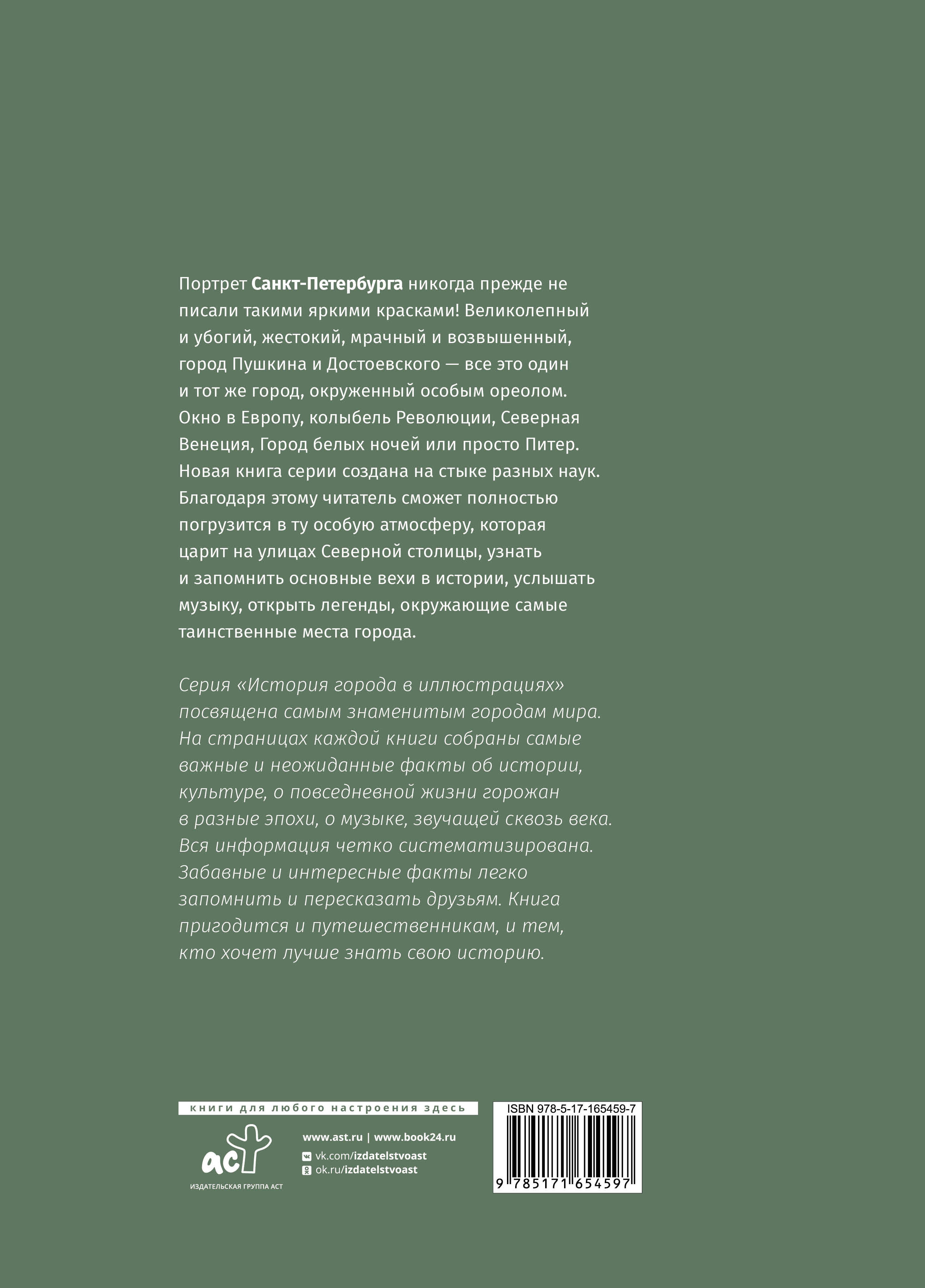 Портрет Санкт-Петербурга никогда прежде не писали такими яркими красками! Велико- лепный и убогий, жестокий, мрачный и возвышенный, город Пушкина и Достоевского - все это один и тот же город, окруженный особым ореолом. Окно в Европу, колыбель Революции, Северная Венеция, Город белых ночей или просто Питер. Новая книга серии создана на сты- ке разных наук. Благодаря этому читатель сможет полностью погрузится в ту особую атмос- феру, которая царит на улицах Северной столицы, узнать и запомнить основные вехи в исто- рии, услышать музыку, открыть легенды, окружающие самые таинственные места города. Серия "История города в иллюстрациях" посвящена самым знаменитым городам мира. На страницах каждой книги собраны самые важные и неожиданные факты об истории, куль- туре, о повседневной жизни горожан в разные эпохи, о музыке, звучащей сквозь века. Вся информация четко систематизирована. Забавные и интересные факты легко запомнить и пе- ресказать друзьям. Книга пригодится и путешественникам, и тем, кто хочет лучше знать свою историю.| Издательство | Издательство "АСТ" |