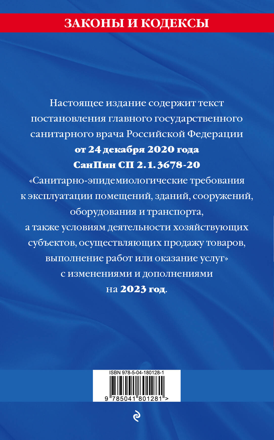 Настоящее издание содержит текст постановления гланого госудрственного санитарного врача Российской Федерации от 24 декабря 2020 года ""Санитарно-эпидемиологические требования к эксплуатации помещений, зданий, сооружений, оборудования и транспорта, а также условиям деятельности хозяйствующих субъектов, осуществляющих продажу товаров, выполнение работ или оказание услуг"" с изменениями и дополнениями на 2023 год.| Издательство | ООО "Издательство "Эксмо" |