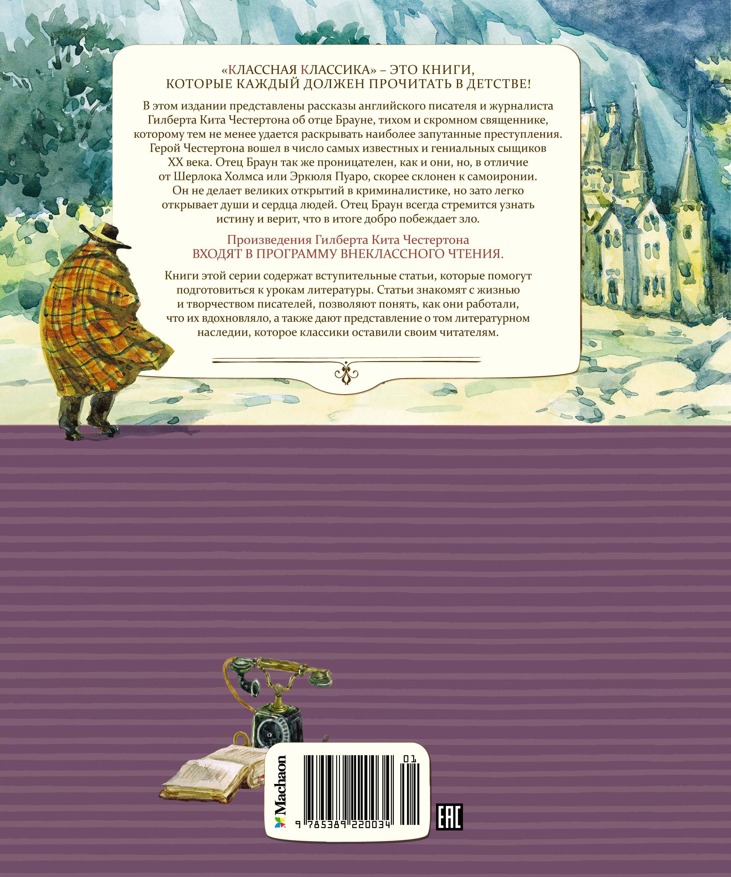 В этом издании представлены рассказы английского писателя и журналиста Гилберта Кита Честертона об отце Брауне, тихом скромном священнике, которому тем не менее удаётся раскрывать самые запутанные преступления. Герой Честертона вошёл в число самых известных и гениальных сыщиков XX века. Отец Браун так же проницателен, как и они, но в отличие от Шерлока Холмса или Эркюля Пуаро, скорее склонен к самоиронии. Он не делает великих открытий в криминалистике, но зато легко открывает души и сердца людей. Отец Браун всегда стремится узнать истину и верит, что в итоге добро побеждает зло.| Издательство | Азбука-Аттикус Издат.группа ООО |