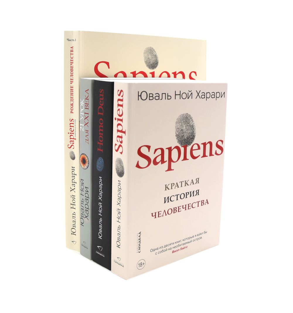 Комплект из 4 книг: «Sapiens Графическая история. Часть 1. Рождение человечества» Это ошеломляющая история о том, как ничем не примечательное млекопитающие стало человеком, который научился расщеплять атом, летать на Луну, манипулировать генетическим кодом и обрел абсолютную власть над планетой. В этом захватывающем дух путешествии в глубокие дерби истории вашим гидом будет Юваль Ной Харари, а компанию вам составят Первобытный Билл, доктор Фантазия и детектив Лопес. Иллюстрированный формат позволит взглянуть на события нашего далекого прошлого другими глазами: эволюция человека представлена через телевизионное реалити-шоу, первая встреча сапиенсов и неандертальцев осмысляется через шедевры современного искусства, а исчезновение с лица Земли мамонтов и саблезубых кошек становится предметом расследования в кинодетективе. Так об истории человечества не рассказывал еще никто. «Sapiens. Краткая история человечества» Сто тысяч лет назад Homo sapiens был одним из как минимум шести видов человека, живших на этой планете, - ничем не примечательным животным, которое играло в экосистеме роль не большую, чем гориллы, светлячки или медузы. Но около семидесяти тысяч лет назад загадочное изменение когнитивных способностей Homo sapiens превратило его в хозяина планеты и кошмар экосистемы. Как человек разумный сумел покорить мир? Что стало с другими видами человека? Когда и почему появились деньги, государства и религия? Как возникали и рушились империи? Почему почти все общества ставили женщин ниже мужчин? Как наука и капитализм стали господствующими вероучениями современной эры? Становились ли люди с течением времени счастливее? Какое будущее нас ожидает? «Homo Deus. Краткая история будущего» В своей первой книге, ставшей всемирной сенсацией «Sapiens. Краткая история человечества», Юваль Харари рассказал, как Человек Разумный пришел к господству над нашей планетой. «Homo Deus» является своего рода продолжением темы - это попытка заглянуть в будущее. Что произойдет, когда Google и Facebook будут лучше, чем мы сами, знать наши вкусы, личные симпатии и политические предпочтения? Что будут делать миллиарды людей, вытесненных компьютерами с рынка труда и образовавших новый, бесполезный класс? Как воспримут религии генную инженерию? Каковы будут последствия перехода полномочий и компетенций от живых людей к сетевым алгоритмам? Что должен предпринять человек, чтобы защитить планету от своей же разрушительной силы?.. Главное сейчас, полагает Харари, - осознать, что мы находимся на перепутье, и понять, куда ведут пути, простирающиеся перед нами. Мы не в силах остановить ход истории, но можем выбрать направление движения. «21 урок для XXI века» «21 урок для XXI века» - третья книга Юваля Харари, автора изданных на 50 языках мира бестселлеров «Sapiens. Краткая история человечества» и «Homo Deus. Краткая история будущего». В ней сорокатрехлетний профессор истории, которого называют самым ярким мыслителем нашего времени, обратился к проблемам сегодняшнего дня. Что происходит в современном мире и каков глубинный смысл этих событий? Почему либеральная демократия переживает кризис? Как быть с эпидемией фейковых новостей? Как не стать рабами компьютерных алгоритмов? Удастся ли предотвратить экологический коллапс? Действительно ли происходит возврат к религии? Как бороться с терроризмом? Буд