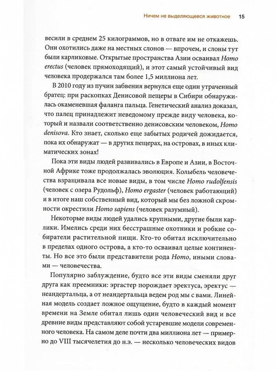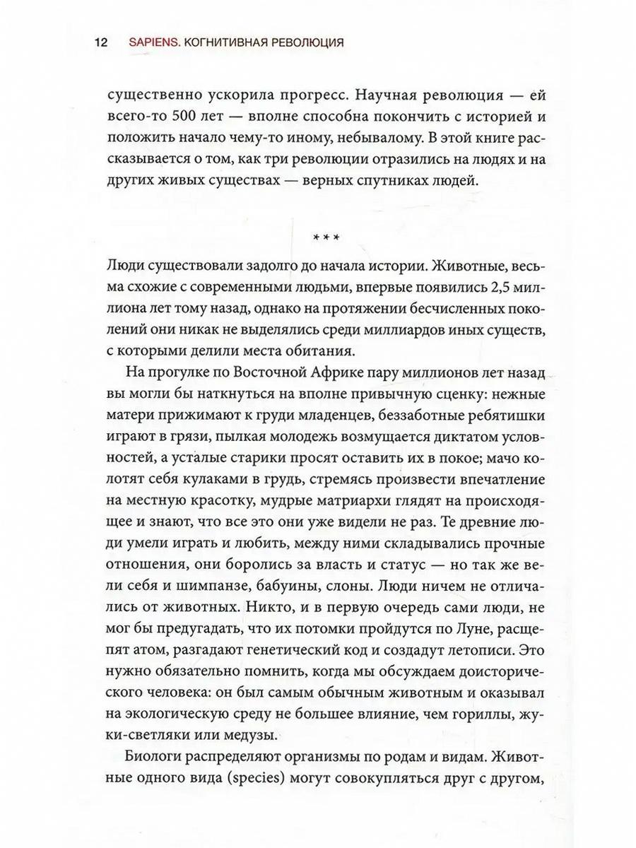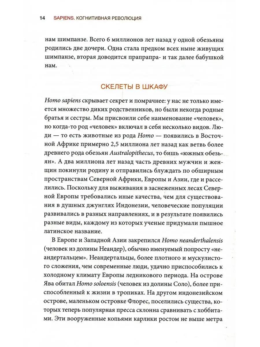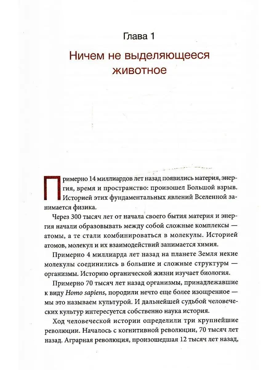 Сто тысяч лет назад Homo sapiens был одним из как минимум шести видов человека, живших на этой планете, - ничем не примечательным животным, которое играло в экосистеме роль не большую, чем гориллы, светлячки или медузы. Но около семидесяти тысяч лет назад загадочное изменение когнитивных способностей Homo sapiens превратило его в хозяина планеты и кошмар экосистемы. Как человек разумный сумел покорить мир? Что стало с другими видами человека? Когда и почему появились деньги, государства и религия? Как возникали и рушились империи? Почему почти все общества ставили женщин ниже мужчин? Как наука и капитализм стали господствующими вероучениями современной эры? Становились ли люди с течением времени счастливее? Какое будущее нас ожидает? Юваль Харари показывает, как ход истории формировал человеческое общество и действительность вокруг него. Книга прослеживает связь между событиями прошлого и проблемами современности и заставляет читателя пересмотреть все устоявшиеся представления об окружающем мире.| Издательство | Синдбад |