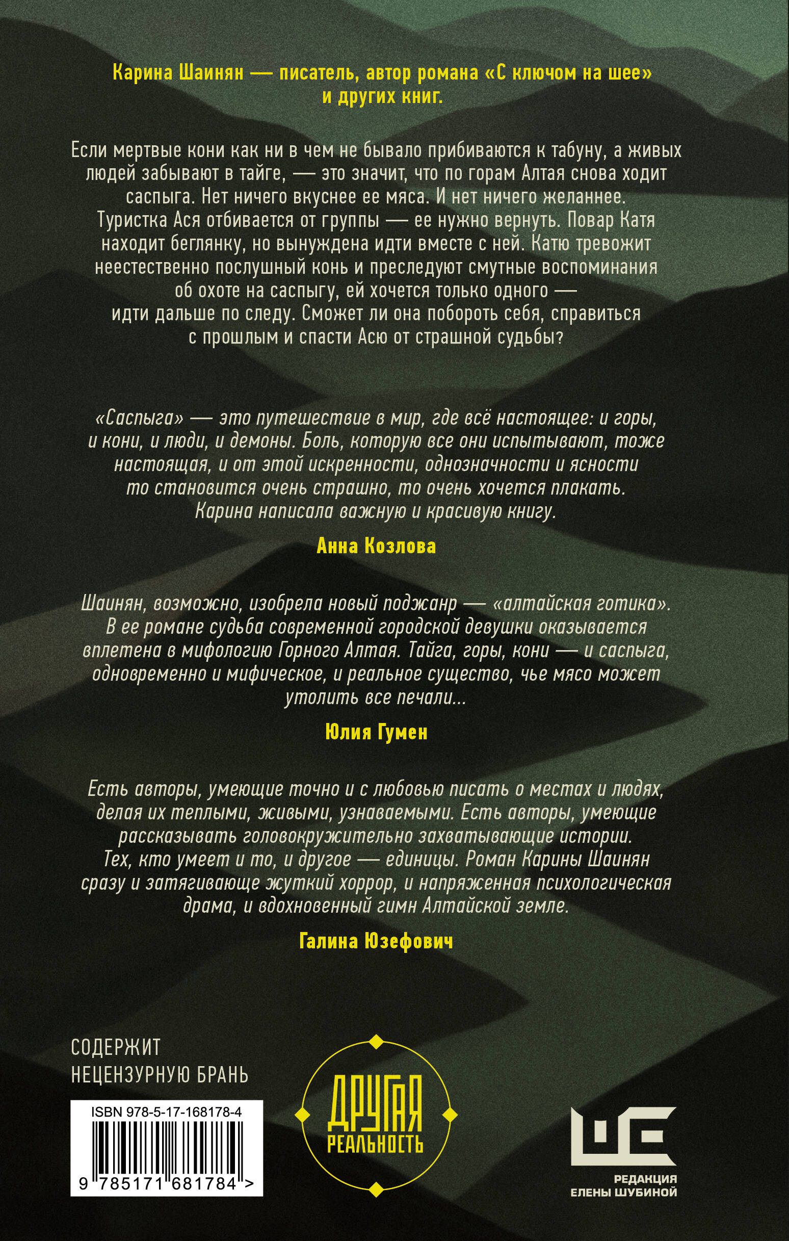Карина Шаинян - писатель, автор романа "С ключом на шее" и других книг. Если мертвые кони как ни в чем не бывало прибиваются к табуну, а живых людей забывают в тайге, - это значит, что по горам Алтая снова ходит саспыга. Нет ничего вкуснее ее мяса. И нет ничего желаннее. Туристка Ася отбивается от группы - ее нужно вернуть. Повар Катя находит беглянку, но вынуждена идти вместе с ней. Катю тревожит неестественно послушный конь и преследуют смутные воспоминания об охоте на саспыгу, ей хочется только одного - идти дальше по следу. Сможет ли она побороть себя, справиться с прошлым и спасти Асю от страшной судьбы? ""Саспыга" - это путешествие в мир, где всё настоящее: и горы, и кони, и люди, и демоны. Боль, которую все они испытывают, тоже настоящая, и от этой искренности, однозначности и ясности то становится очень страшно, то очень хочется плакать. Карина написала важную и красивую книгу". (Анна Козлова) "Шаинян, возможно, изобрела новый поджанр - "алтайская готика". В ее романе судьба современной городской девушки оказывается вплетена в мифологию Горного Алтая. Тайга, горы, кони - и саспыга, одновременно и мифическое, и реальное существо, чье мясо может утолить все печали…" (Юлия Гумен) "Есть авторы, умеющие точно и с любовью писать о местах и людях, делая их теплыми, живыми, узнаваемыми. Есть авторы, умеющие рассказывать головокружительно захватывающие истории. Тех, кто умеет и то, и другое - единицы. Роман Карины Шаинян сразу и затягивающе жуткий хоррор, и напряженная психологическая драма, и вдохновенный гимн Алтайской земле". (Галина Юзефович)| Издательство | Издательство "АСТ" |