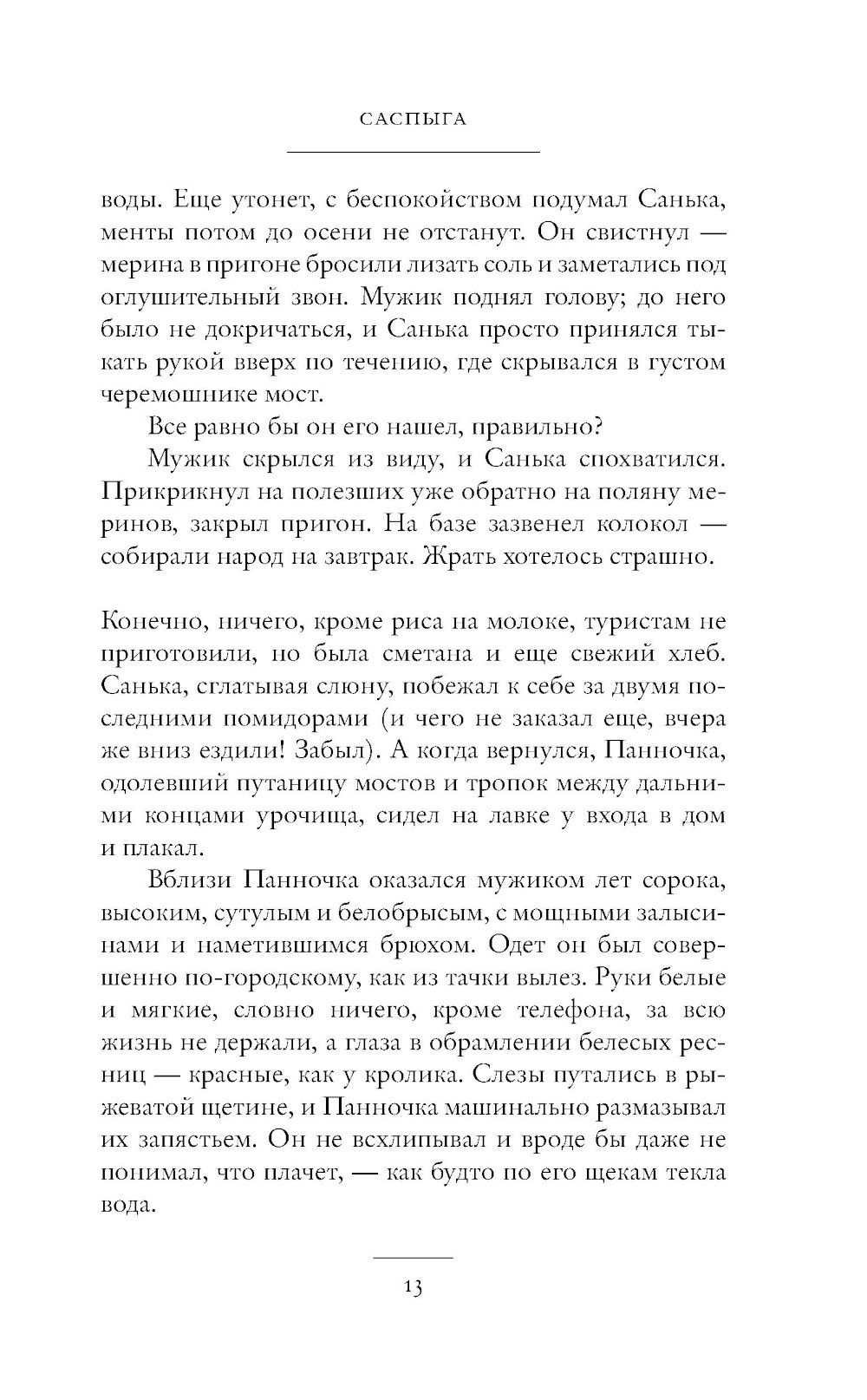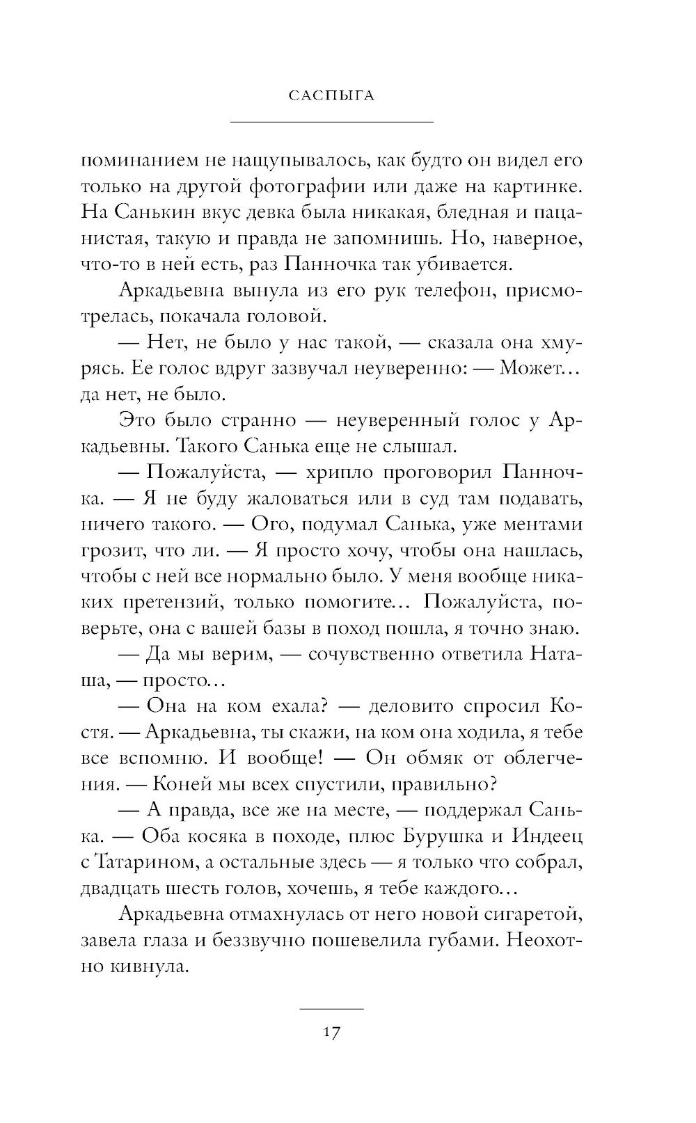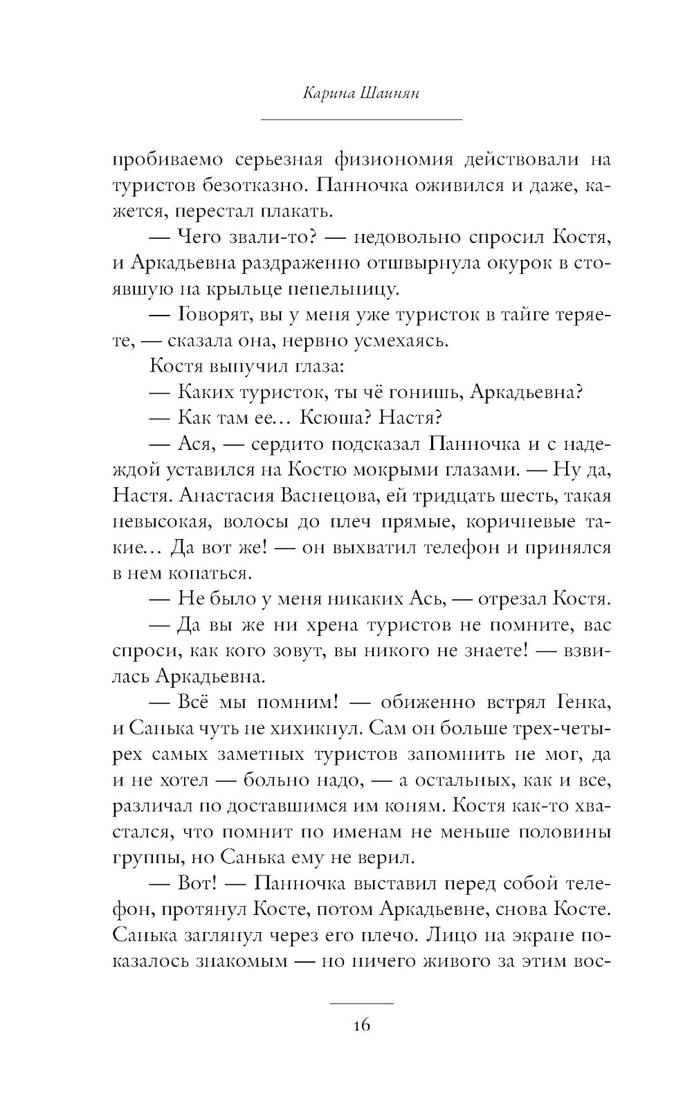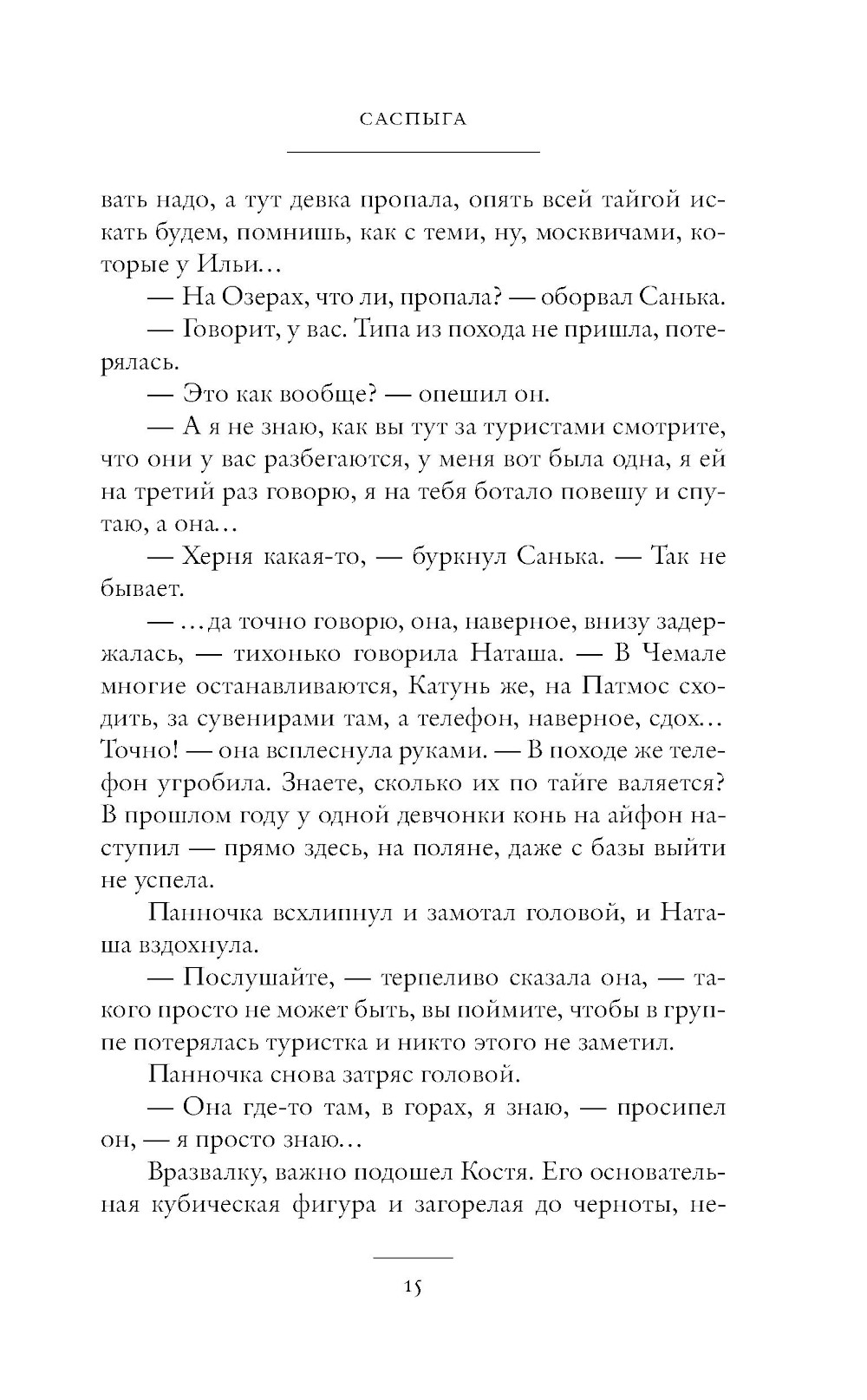 Карина Шаинян - писатель, автор романа «С ключом на шее» и других книг. Если мертвые кони как ни в чем не бывало прибиваются к табуну, а живых людей забывают в тайге, - это значит, что по горам Алтая снова ходит саспыга. Нет ничего вкуснее ее мяса. И нет ничего желаннее. Туристка Ася отбивается от группы - ее нужно вернуть. Повар Катя находит беглянку, но вынуждена идти вместе с ней. Катю тревожит неестественно послушный конь и преследуют смутные воспоминания об охоте на саспыгу, ей хочется только одного - идти дальше по следу. Сможет ли она побороть себя, справиться с прошлым и спасти Асю от страшной судьбы? ««Саспыга» - это путешествие в мир, где всё настоящее: и горы, и кони, и люди, и демоны. Боль, которую все они испытывают, тоже настоящая, и от этой искренности, однозначности и ясности то становится очень страшно, то очень хочется плакать. Карина написала важную и красивую книгу». (Анна Козлова) «Шаинян, возможно, изобрела новый поджанр - «алтайская готика». В ее романе судьба современной городской девушки оказывается вплетена в мифологию Горного Алтая. Тайга, горы, кони - и саспыга, одновременно и мифическое, и реальное существо, чье мясо может утолить все печали...» (Юлия Гумен) «Есть авторы, умеющие точно и с любовью писать о местах и людях, делая их теплыми, живыми, узнаваемыми. Есть авторы, умеющие рассказывать головокружительно захватывающие истории. Тех, кто умеет и то, и другое - единицы. Роман Карины Шаинян сразу и затягивающе жуткий хоррор, и напряженная психологическая драма, и вдохновенный гимн Алтайской земле». (Галина Юзефович)