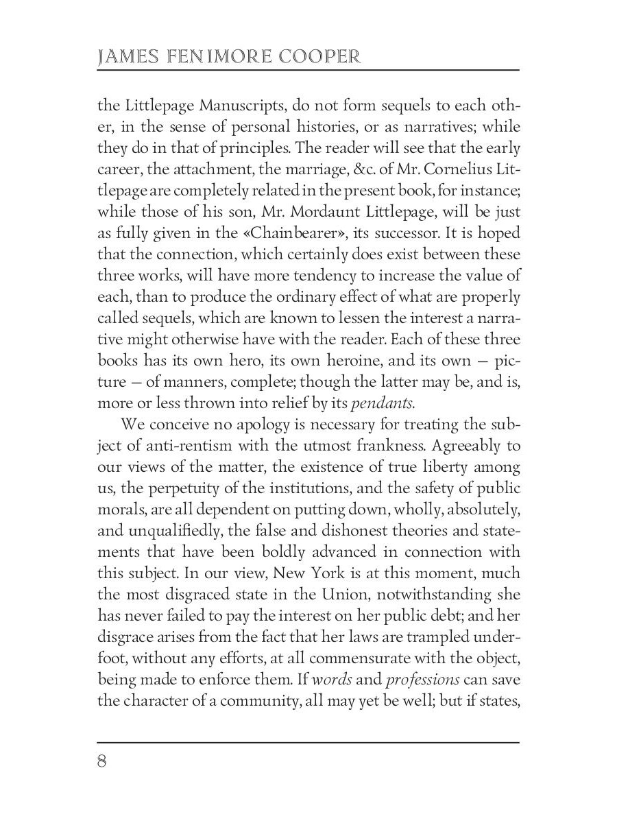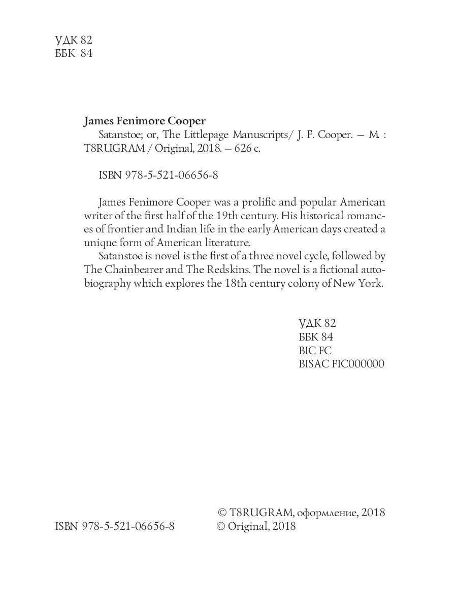 James Fenimore Cooper was a prolific and popular American writer of the first half of the 19th century. His historical romances of frontier and Indian life in the early American days created a unique form of American literature. Satanstoe is novel is the first of a three novel cycle, followed by The Chainbearer and The Redskins. The novel is a fictional autobiography which explores the 18th century colony of New York.| Издательство | Т8 RUGRAM |