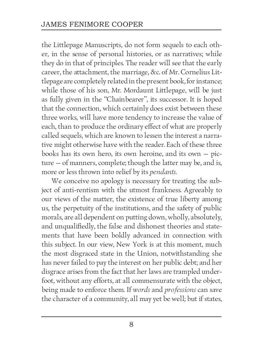 James Fenimore Cooper was a prolific and popular American writer of the first half of the 19th century. His historical romances of frontier and Indian life in the early American days created a unique form of American literature. Satanstoe is the first of a three novels cycle "The Littlepage Manuscripts", followed by "The Chainbearer" and "The Redskins". The novel is a fictional autobiography, that gives a comprehensive view of colonial life and society in New York State in the middle of the eighteenth century, blending all these elements with the narrative skill for which the author has always been famous.
