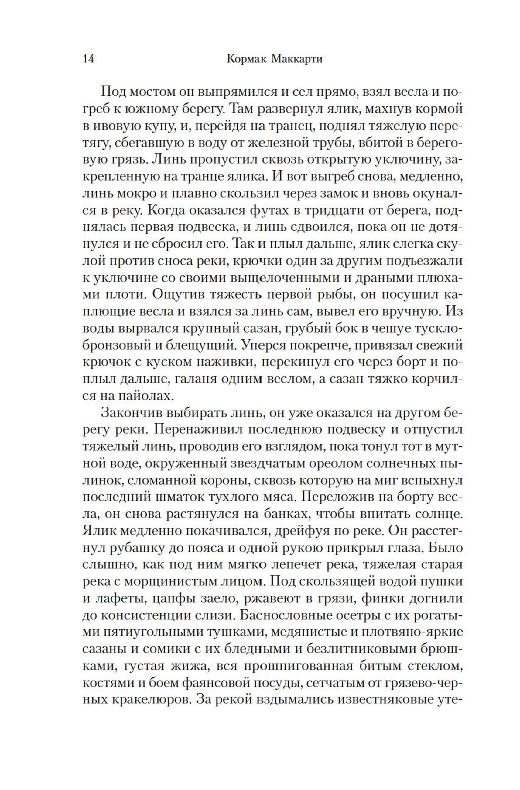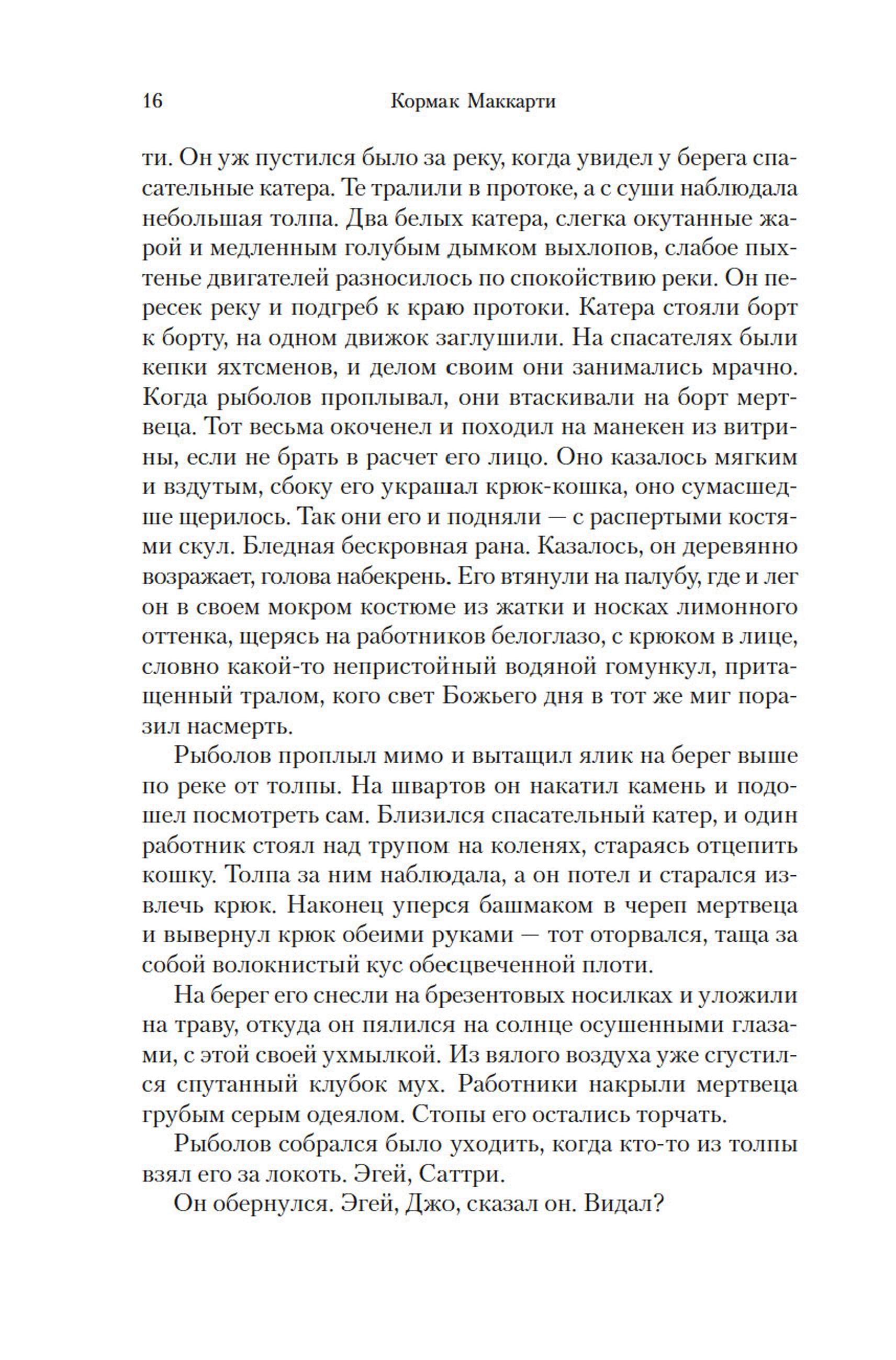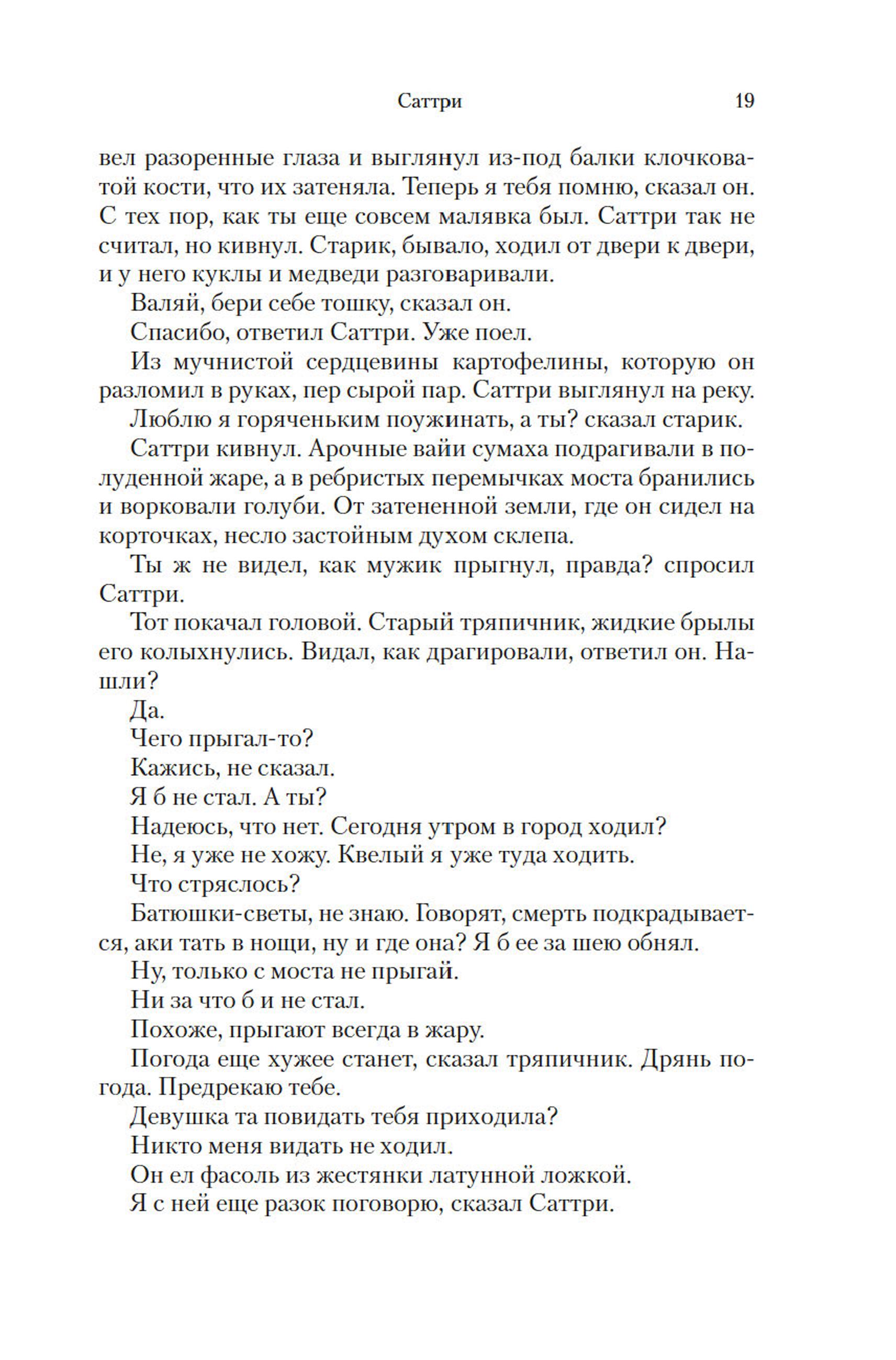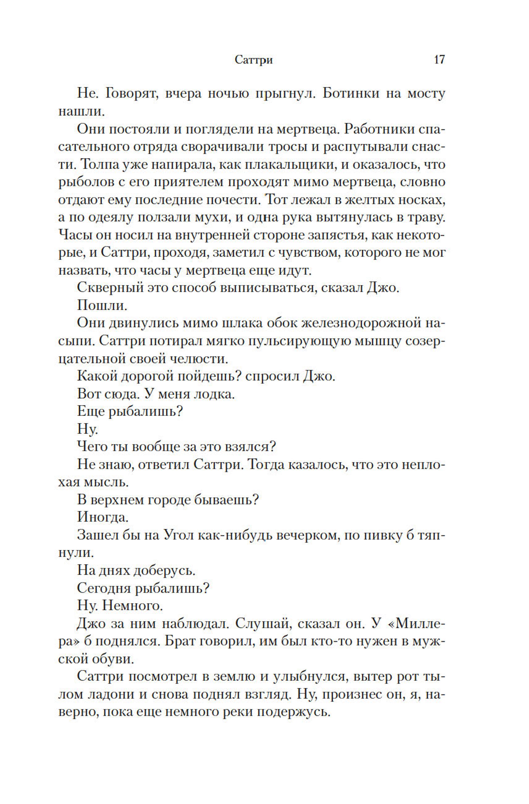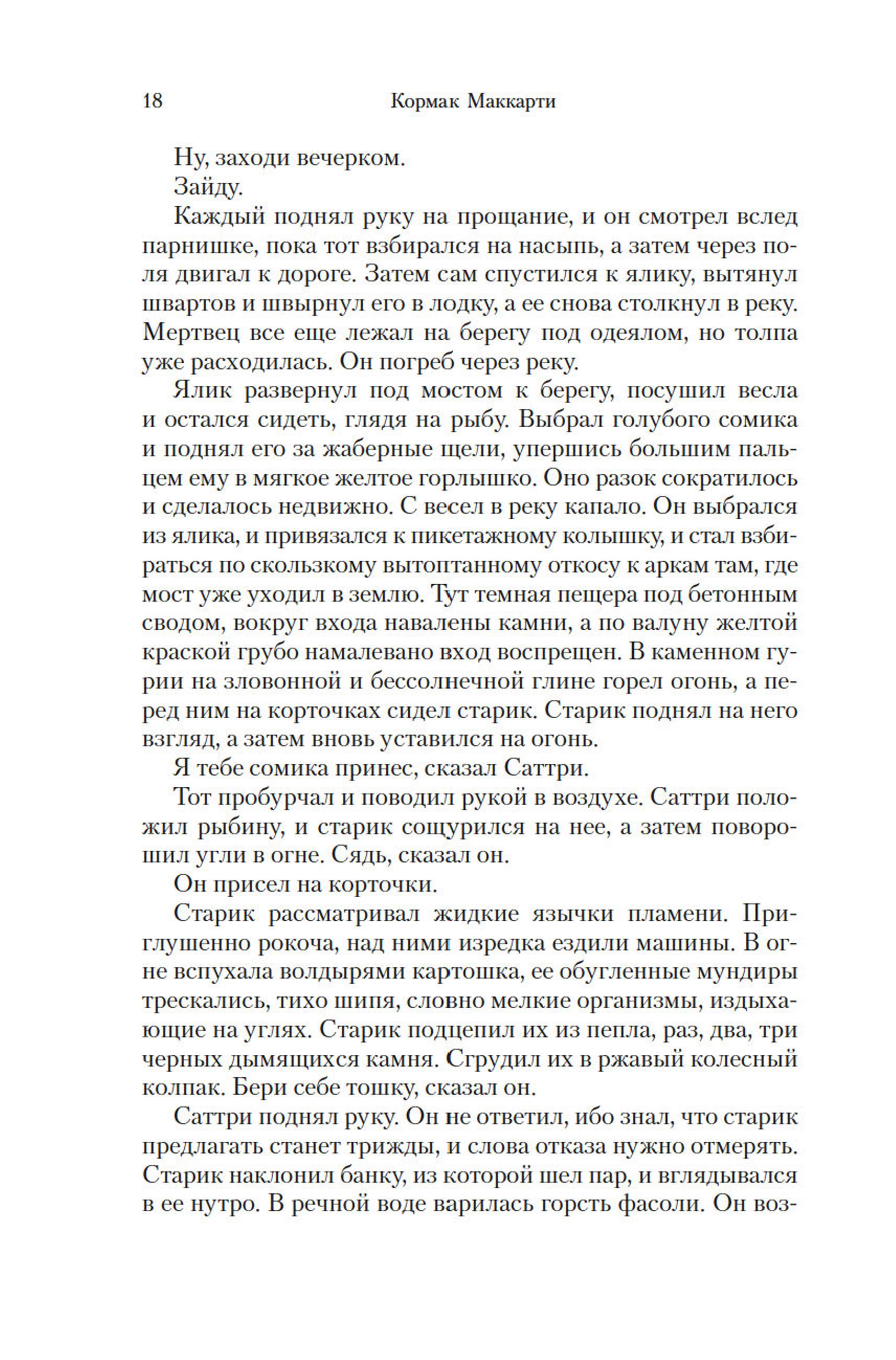 Кормак Маккарти - современный американский классик главного калибра, лауреат Макартуровской стипендии «За гениальность», мастер сложных переживаний и нестандартного синтаксиса, хорошо известный нашему читателю романами «Старикам тут не место» (фильм братьев Коэн по этой книге получил четыре «Оскара») и «Дорога» (получил Пулицеровскую премию и также был экранизирован), «Пограничной трилогией» (первый роман которой, «Кони, кони…», получил Национальную книжную премию США и был перенесен на экран Билли Бобом Торнтоном, главные роли исполнили Мэтт Деймон и Пенелопа Крус) и «Кровавым меридианом». Особое место в его наследии занимает эпичная трагикомедия «Саттри» - «немыслимое - и притом совершенно органичное - сочетание«Улисса» Джеймса Джойса и «Консервного ряда» Джона Стейнбека» (New York Times), «практически автобиография» знаменитого затворника. Итак, место действия - Ноксвилл, штат Теннесси; на дворе 1950-е годы. Корнелиус Саттри, отпрыск богатой семьи, по неизвестным причинам бросил жену с маленьким сыном и поселился в плавучем доме на реке. Он питается рыбой, которую сам выловил, пьет все, что горит (и что приносят друзья), проводит время жизни «в обществе воров, отщепенцев, негодяев… бездельников, грубиянов, пентюхов, убийц, игроков, сводниц… олухов, шмаровозов… и прочих разнообразных и злонамеренных пакостников», но не теряет человеческого достоинства и смотрит на мир с отрешенной непосредственностью. Впервые на русском!| Издательство | Иностранка |
