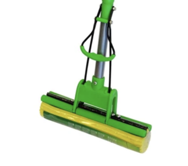 Швабра оснащена губкой из PVA, которая отлично впитывает влагу и подходит для очистки всех твёрдых напольных покрытий (плитка, ламинат, паркет и др.). Встроенный механизм отжима позволяет удалять лишнюю воду без контакта с руками. Телескопическая ручка регулируется по длине для удобства пользователя.