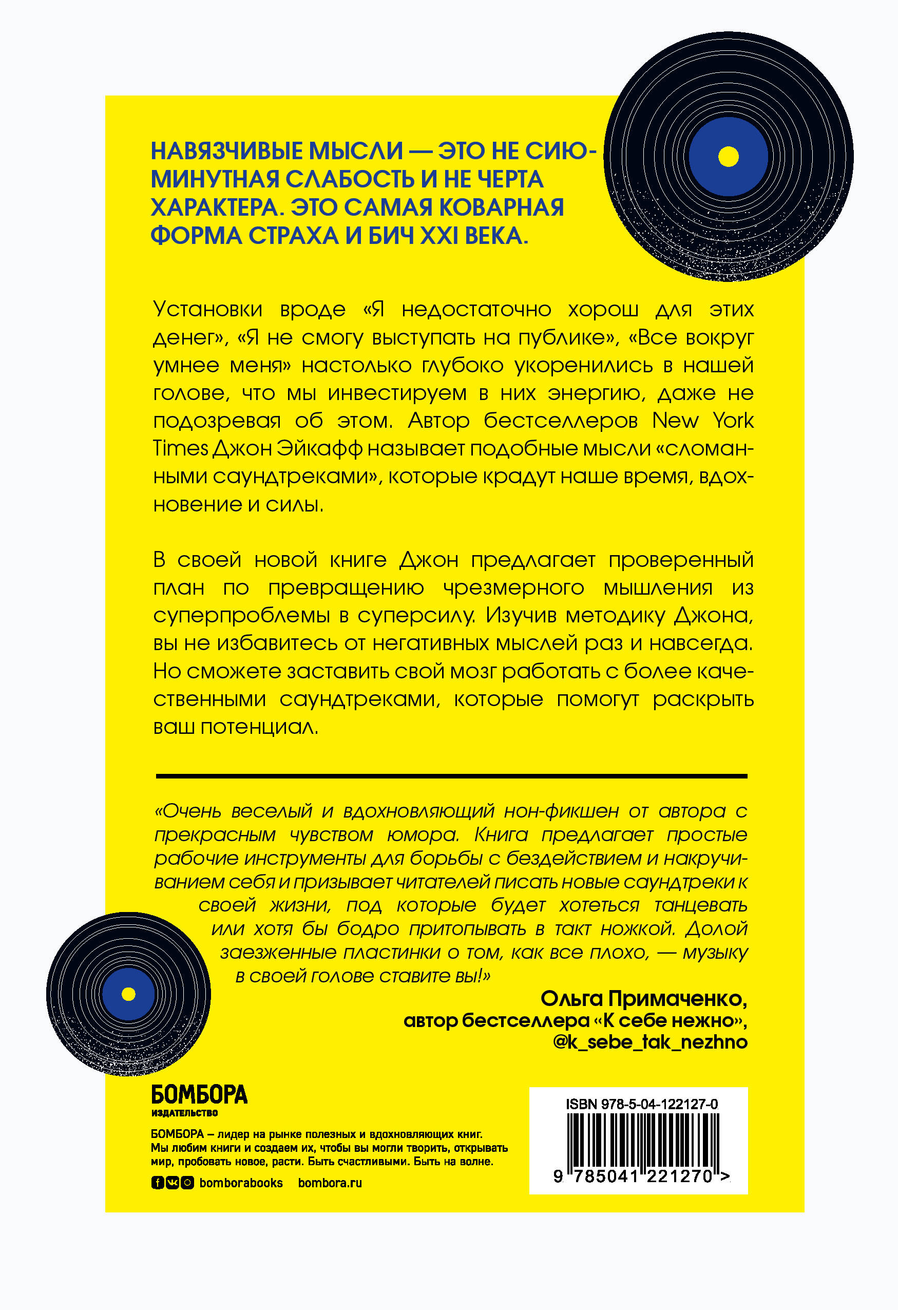 ЦИТАТЫ: «Вот что делает чрезмерное накручивание. Оно находит негативный саундтрек и воспроизводит его снова и снова». «Сломанные саундтреки - одно из самых убедительных проявлений страха». «Я не знаю, какая у вас мечта; возможно, она кардинально отличается от моей. Но я знаю одно: чрезмерное накручивание мешает ей стать реальностью». «Когда вы сами выбираете саундтреки, которые будете слушать чаще и больше, нет предела тому, что вы сможете сделать». «Признание своих способностей - отличный способ начать учиться тому, что вам нужно сделать». ОТЗЫВЫ: «Если вы готовы изменить повествование вашей жизни, Джон Эйкафф готов в этом помочь. Простая, мощная и щедрая книга, которую вы будете вспоминать каждый день до конца своей жизни». - Сет Годин, автор книги «Фиолетовая корова. Сделайте свой бизнес выдающимся!» Джон Эйкафф обнаружил скрытое препятствие на пути к успеху и разработал план его устранения. Так что не думайте над решением слишком долго. Просто возьмите эту практичную, забавную книгу и приготовьтесь делать заметки». - Дэниел Пинк, автор книг-бестселлеров New York Times «Драйв. Что на самом деле нас мотивирует», «Человеку свойственно продавать» и «Таймхакинг» «Я не могу сосчитать, сколько раз я говорил лидерам: "Вы слишком много думаете над этим решением". Это естественный враг фокусирования на проблеме, и я так рад, что Джон Эйкафф вступил в борьбу со свежим взглядом на эту критическую тему». - Майкл Хайятт, автор бестселлеров New York Times ОБ АВТОРЕ: Джон Эйкафф - автор семи бестселлеров New York Times, в том числе таких книг, как «Начни. Врежь страху по лицу. Перестань быть "нормальным" и займись чем-то стоящим», «Перезаряди карьеру. Встряхни связи, навыки, достоинства и, наконец, стань тем, кем хотел» и «Закончи то, что начал. Как доводить дела до конца». Он входит в Топ-100 ведущих спикеров журнала Inc. и выступает по всему миру для таких компаний, как Microsoft, Nissan, Walmart, FedEx и Comedy Central.| Издательство | ООО "Издательство "Эксмо" |