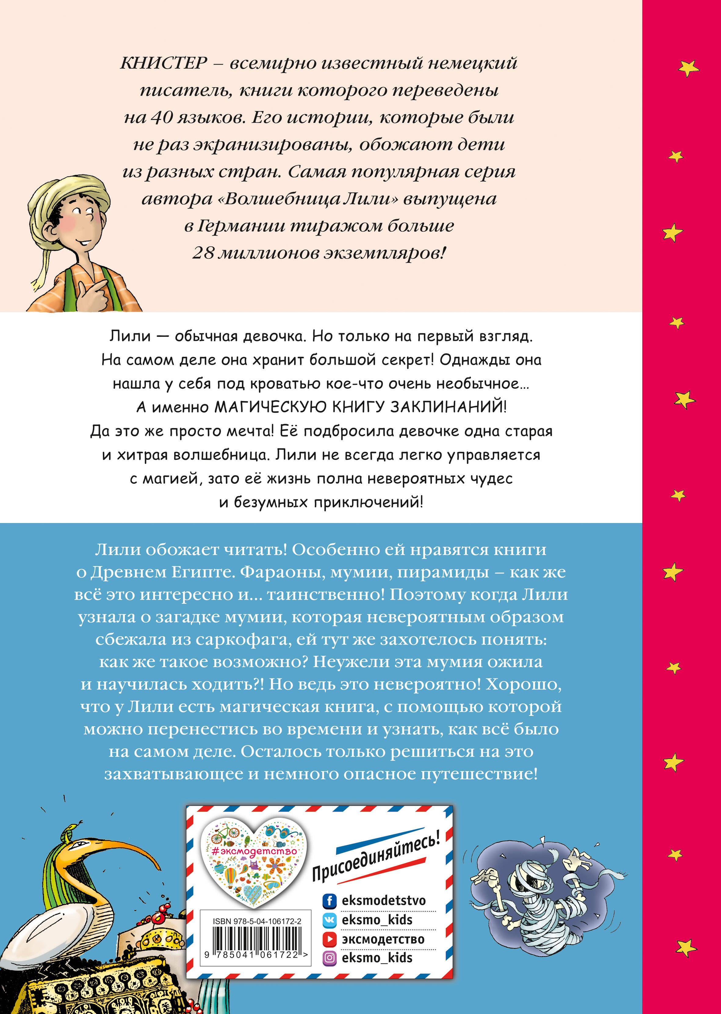У Лили появилось новое увлечение - Древний Египет! Как же интересно читать про фараонов и пирамиды, просто дух захватывает! Неудивительно, что, когда девочка узнала о таинственной мумии, которая сбежала из саркофага, она тут же захотела узнать, как же всё было на самом деле. Ведь не могла же мумия вдруг ожить! Или всё-таки могла? К счастью, у Лили есть магическая книга заклинаний. С её помощью можно легко переместиться в прошлое и раскрыть этот секрет. Правда, придётся набраться храбрости. Ведь бродить по древней пирамиде порой бывает немного страшно… Волшебницу Лили любят дети по всему миру: книги о ней переведены на 40 языков. В книге много цветных иллюстраций - заскучать совершенно точно не получится! А крупный шрифт, плотная бумага и удобный формат сделают издание отличным выбором для самостоятельного чтения.| Издательство | ООО "Издательство "Эксмо" |