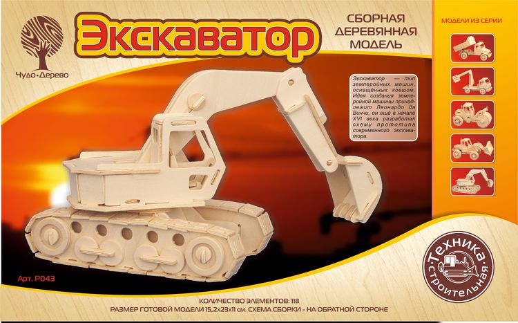 Комплект включает в себя набор деталей, вырезанных на листовом дереве (фанера); схему сборки; наждачную бумагу. Детали скрепляются в порядке и очередности, обозначенной в инструкции. Для прочности соединений рекомендуется использовать клей ПВА (не токсичен, не имеет запаха, после высыхания становится прозрачным, имеет эластичный клеевой шов, при загустевании может быть разбавлен водой).
