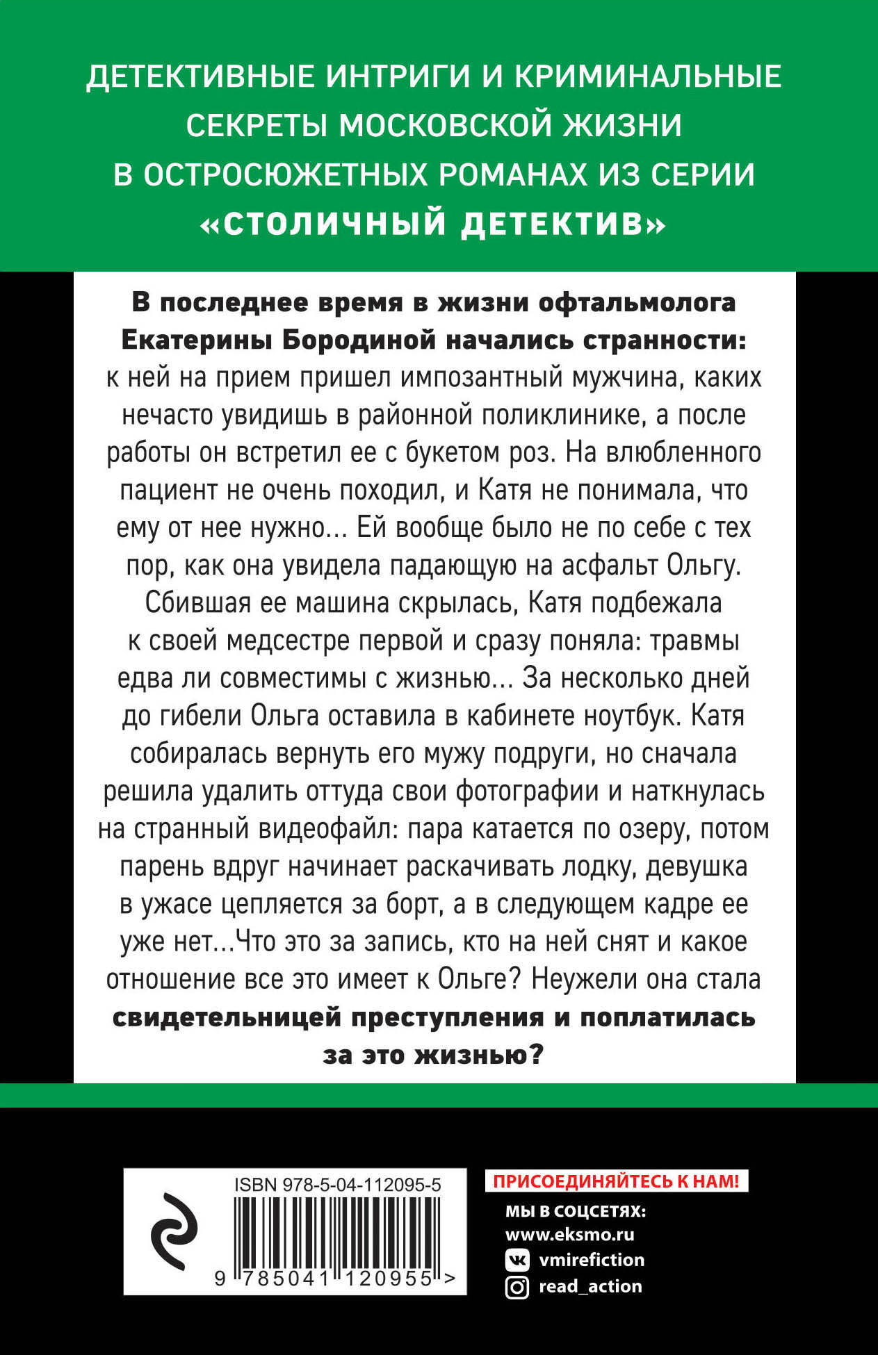 В последнее время в жизни офтальмолога Екатерины Бородиной начались странности: к ней на прием пришел импозантный мужчина, каких нечасто увидишь в районной поликлинике, а после работы он встретил ее с букетом роз. На влюбленного пациент не очень походил, и Катя не понимала, что ему от нее нужно… Ей вообще было не по себе с тех пор, как она увидела падающую на асфальт Ольгу. Сбившая ее машина скрылась, Катя подбежала к своей медсестре первой и сразу поняла: травмы едва ли совместимы с жизнью… За несколько дней до гибели Ольга оставила в кабинете ноутбук. Катя собиралась вернуть его мужу подруги, но сначала решила удалить оттуда свои фотографии и наткнулась на странный видеофайл: пара катается по озеру, потом парень вдруг начинает раскачивать лодку, девушка в ужасе цепляется за борт, а в следующем кадре ее уже нет…Что это за запись, кто на ней снят и какое отношение все это имеет к Ольге? Неужели она стала свидетельницей преступления и поплатилась за это жизнью? Татьяна Устинова рекомендует: «Удивительно, но в книгах Евгении Горской угадывается настроение больших русских романов. Она умещает в детектив современную энциклопедию разнообразнейших губительных страстей, созидательных любовей и ярких, живых, разноголосых героев. Получается не только интересно и зажигательно, но еще и очень по-настоящему - ровно настолько, чтобы захотелось поверить в эту историю. Горская ловко и умеючи держит читателя в напряжении: тебе иногда страшно, иногда смешно, иногда будто бы совсем безнадежно, но в конечном итоге понимаешь: все будет хорошо!»| Издательство | ООО "Издательство "Эксмо" |