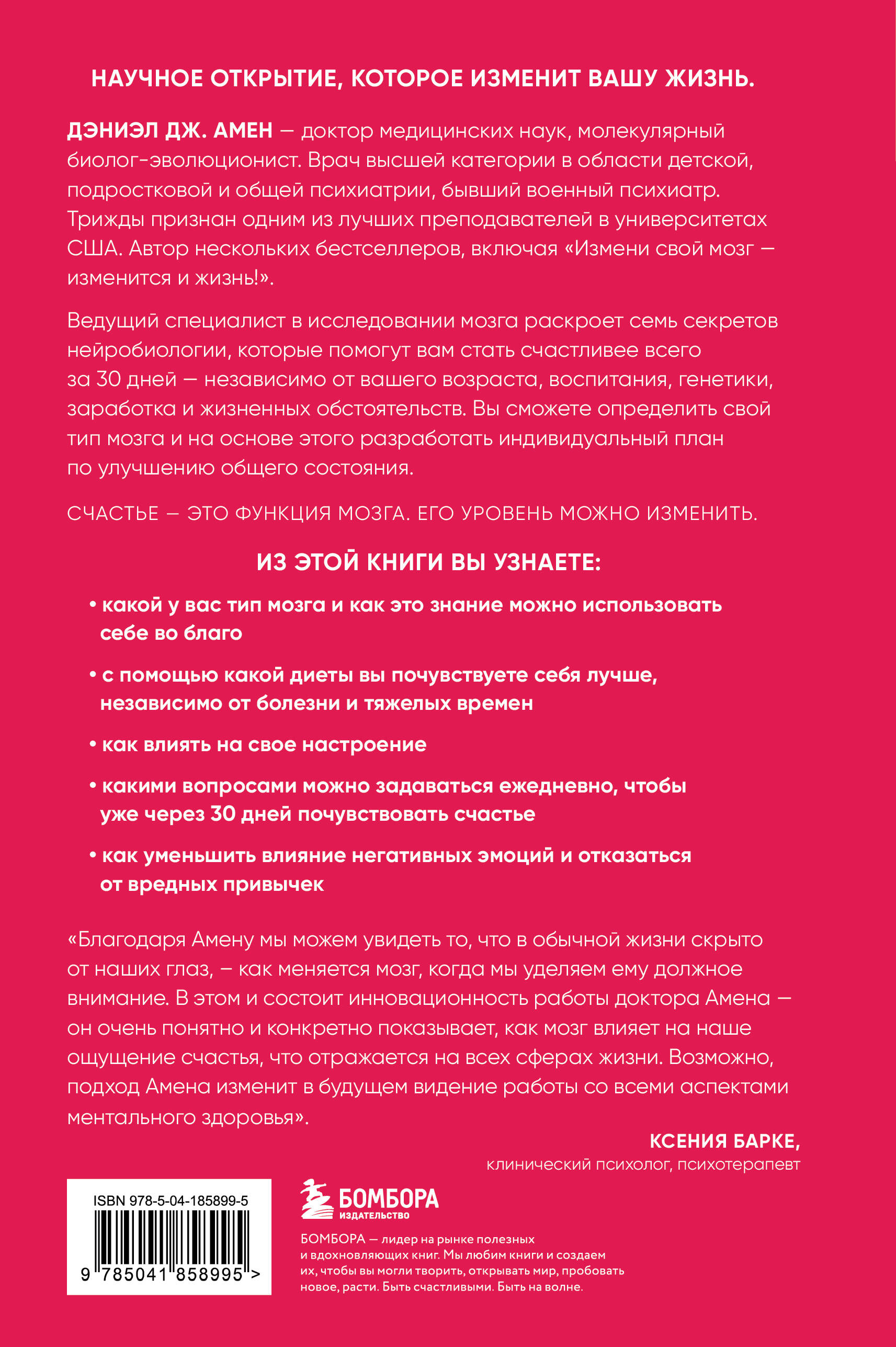 Последние исследования показывают, что счастливые люди меньше болеют инфекционными и психическими заболеваниями, у них ниже кровяное давление, они дольше живут, успешны на работе и имеют крепкие отношения. А еще счастье заразительно - рядом с позитивным человеком людям вокруг становится легче. Вопреки расхожему мнению, счастье - это функция мозга, его уровень можно измерить и повысить. Известный доктор Дэниэл Дж. Амен изучил более 200 000 сканирований мозга людей из 155 стран. На основе этого он открыл семь секретов нейробиологии, которые влияют на уровень счастья. Вы можете определить свой тип мозга и на основе этого разработать индивидуальный план по улучшению общего состояния. Сотни тысяч людей уже смогли навсегда изменить свою жизнь - им на это понадобилось всего 30 дней. И не имеет значения, какой у вас заработок и какая генетика - вы можете повысить уровень счастья благодаря науке и проверенным методикам врача. Из этой книги вы узнаете: - какой у вас тип мозга и как это знание можно использовать себе во благо; - с помощью какой диеты вы почувствуете себя лучше, независимо от болезни, тяжелых времен и жизненных невзгод; - как влиять на свое настроение; - какими вопросами можно задаваться ежедневно, чтобы уже через 30 дней почувствовать счастье; - как уменьшить влияние негативных эмоций и отказаться от вредных привычек. Об авторе Дэниэл Дж. Амен - доктор медицинских наук, молекулярный биолог-эволюционист, занимается изучением генов, участвующих в развитии мозга. Врач высшей категории в области детской, подростковой и общей психиатрии, бывший военный психиатр. Трижды признан одним из лучших преподавателей в университетах США. Автор нескольких бестселлеров, в том числе «Измени свой мозг - изменится и жизнь!».| Издательство | ООО "Издательство "Эксмо" |